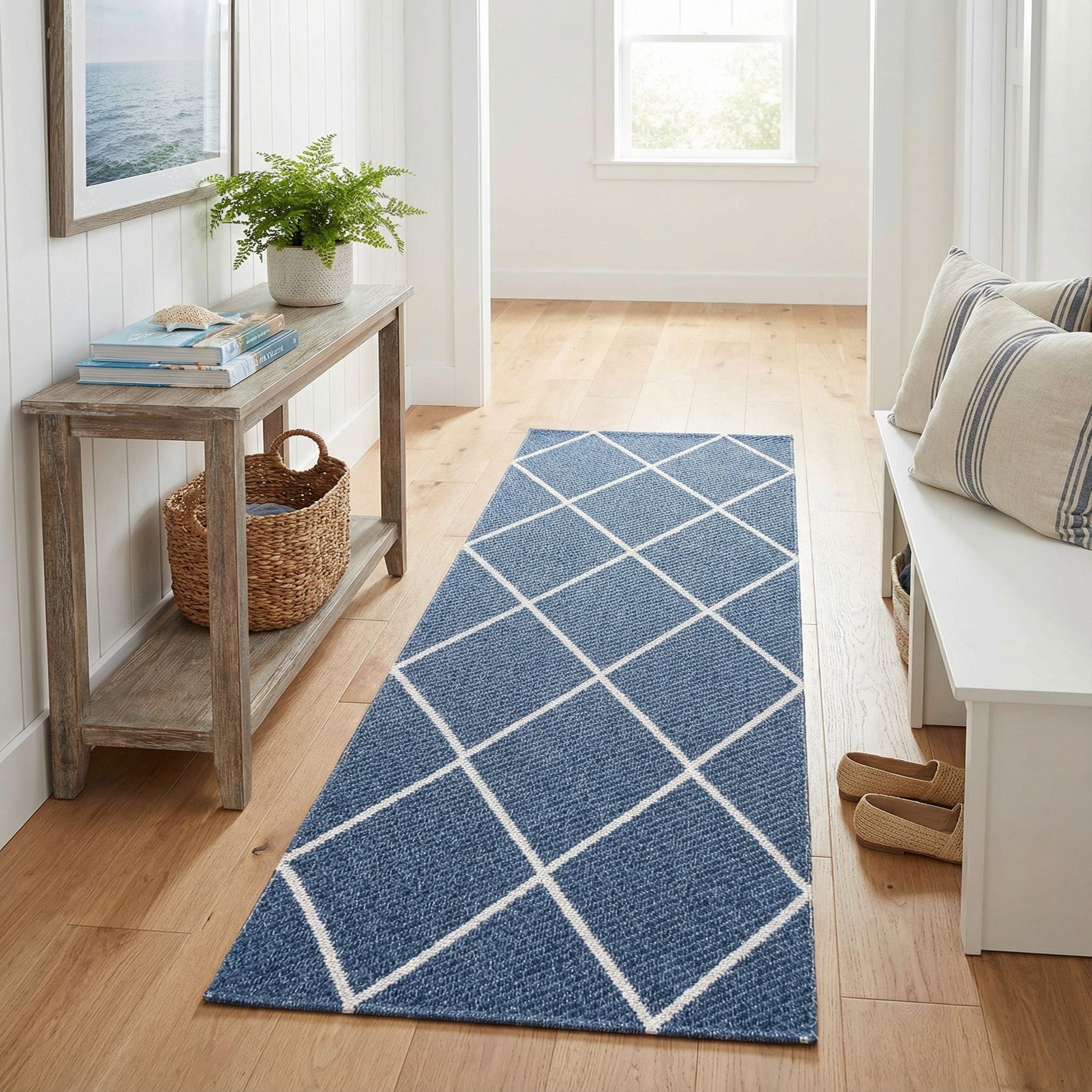 A deep navy blue field provides a rich backdrop for a crisp ivory diamond trellis that runs the length of this runner. The geometric pattern is evenly spaced and balanced, giving the piece a directional rhythm that guides the eye down a hallway or through an entry. Machine-made from 100% cotton, the low-profile weave has a soft, tactile hand with a subtle surface texture where the ivory lines are slightly raised against the navy ground.