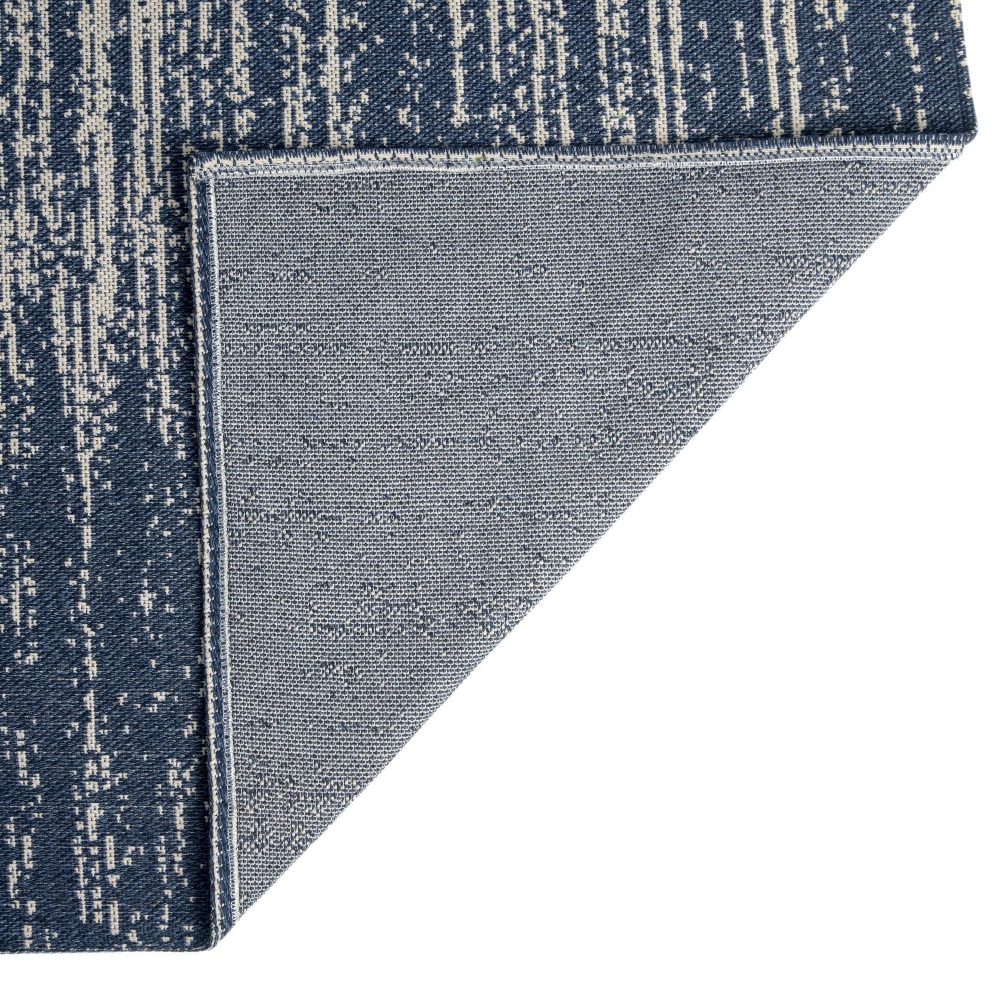 A 6 ft runner rug in shades of navy blue and off-white, featuring a distressed, abstract pattern with a flatweave texture, ideal for a hallway or kitchen.