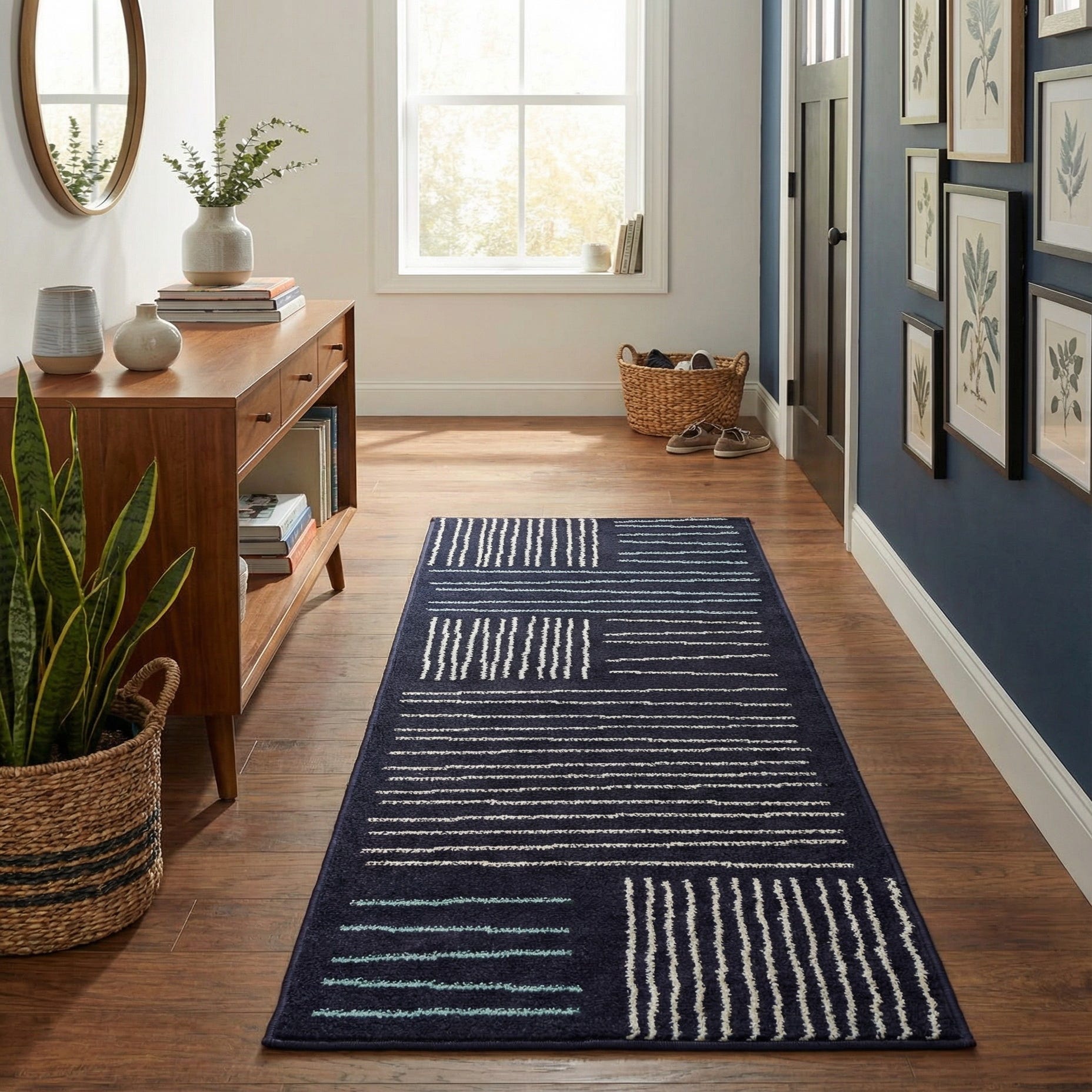 Machine-made from 100% polypropylene, the short, dense pile feels soft and slightly springy underfoot with a subtle sheen that lifts the light blue accents against the navy field. This runner works well in narrow entryways, hallways, or galley kitchens and layers nicely in front of sofas or beds. Pair it with pale wood floors and white trim for a fresh contrast, add brass or matte-black metal accents for a modern edge, or use it to introduce color into a neutral, transitional space.
