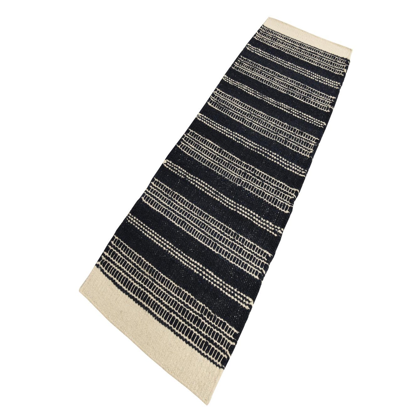 Hand-woven of jute and wool, this runner presents a navy blue background threaded with ivory linear motifs. Broad, chunky navy bands alternate with narrow, ladder-like ivory stripes, creating a clean striped pattern with a handcrafted feel. The construction pairs flat-woven sections with raised, slightly nubby rows, offering a pleasant tactile contrast underfoot and a textured surface that reads both casual and refined.