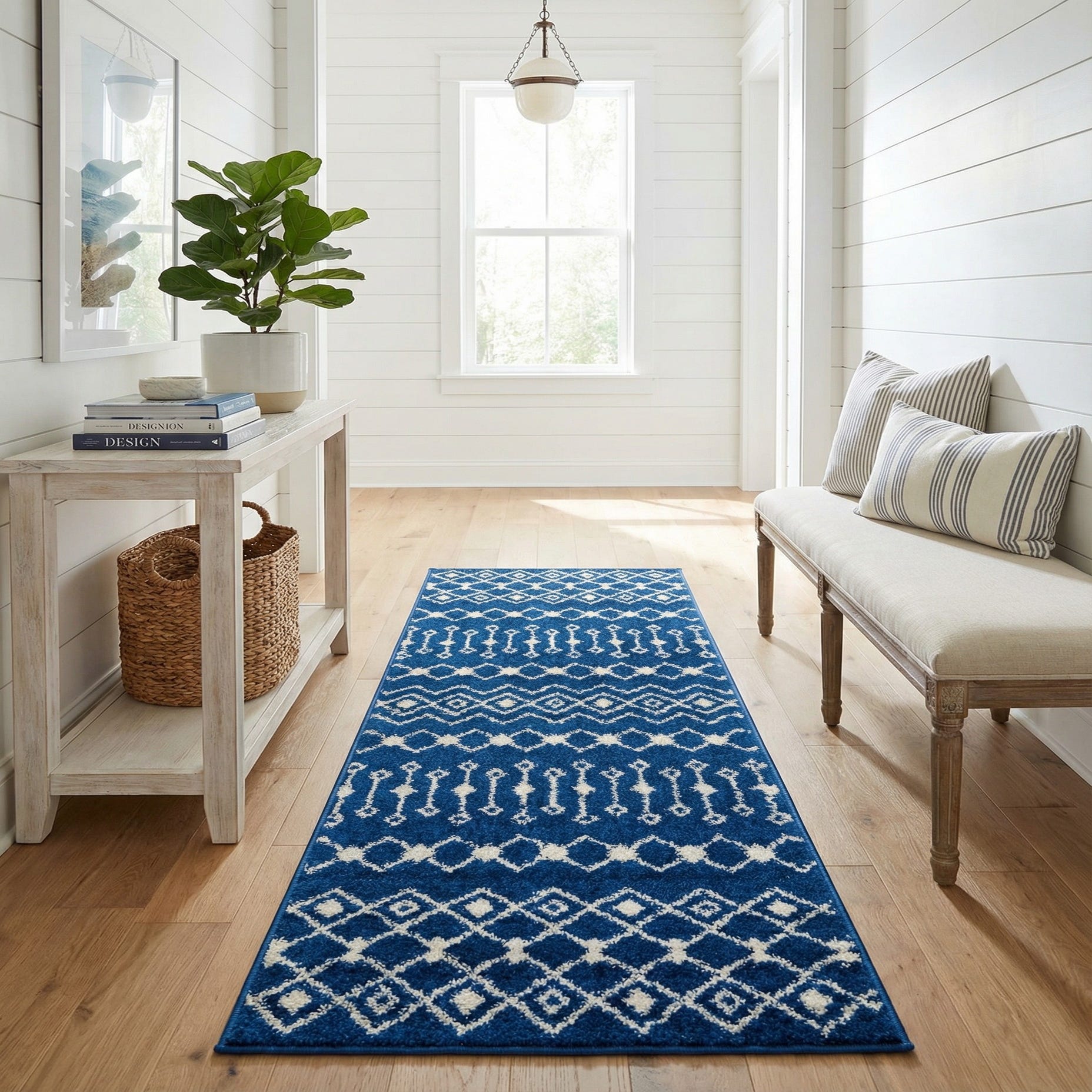 A 6 ft runner rug in navy blue with a white bohemian trellis pattern, featuring a medium pile.