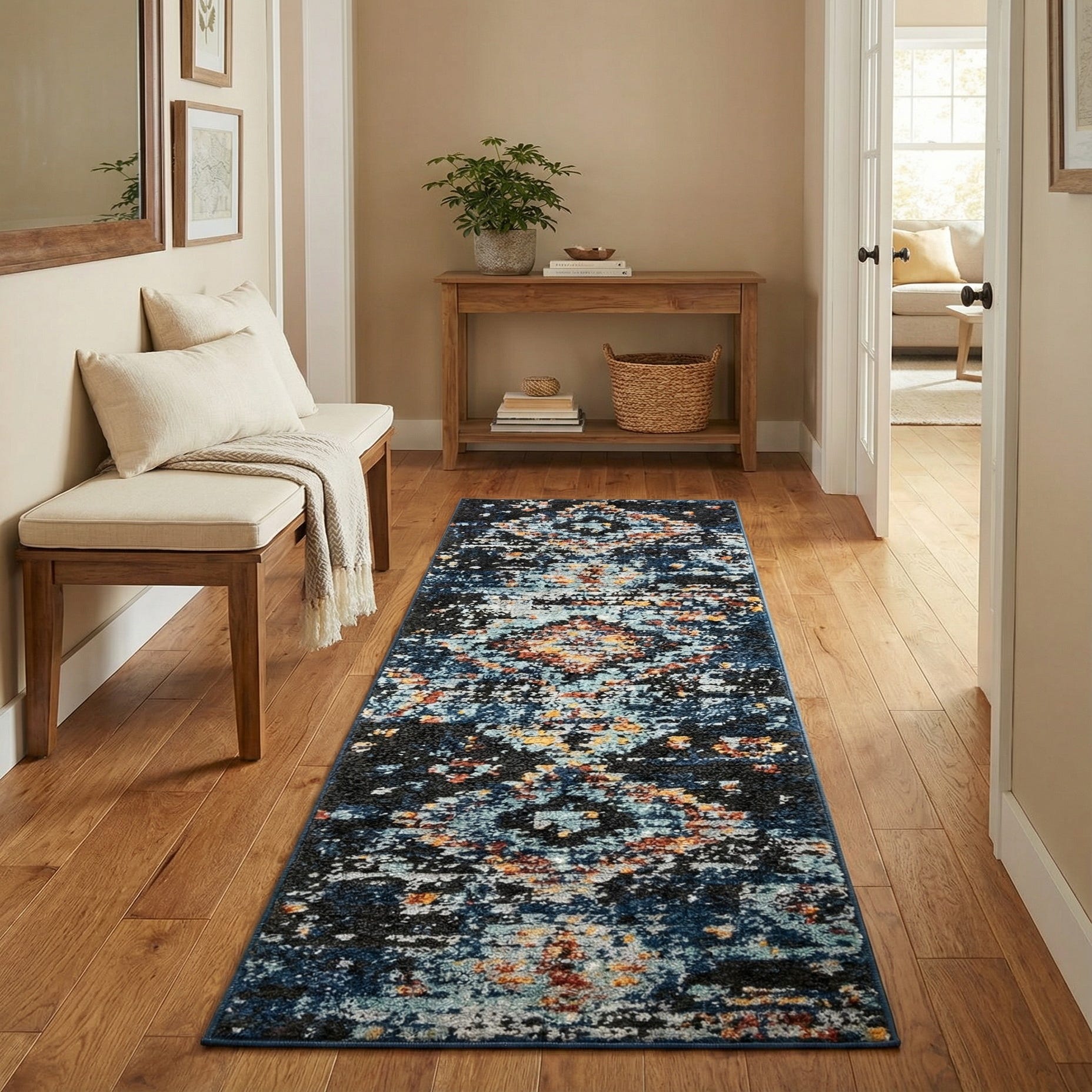 Machine-made from 100% polyester, this runner has a low-to-medium pile with a soft hand underfoot and a subtle sheen from the fibers. It feels dense and cushioned when walked on, making it well suited to high-traffic narrow spaces. Place it in an entry or hallway, layer it at the foot of a bed, or use it to define a galley kitchen or stair landing. It pairs especially well with warm wood tones and leather, complements navy or neutral upholstery, and adds color to industrial and transitional interiors where subtle pattern and saturated blues can tie a room together.