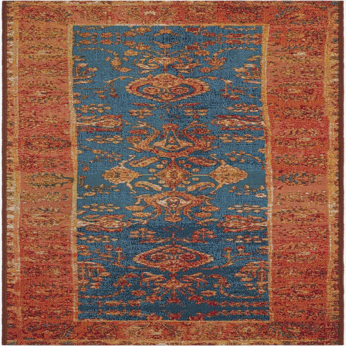 A classic traditional runner with a modern outdoor build, this piece pairs a navy blue background with a warm, rust-red border and layered accents in brown, orange, red, gold and ivory. The pattern centers on an elongated medallion and scrolling floral motifs that repeat along the length, while a subtly distressed finish gives the design an aged, lived-in character. The contrast between the deep navy field and the sun-warmed tones in the border makes the motifs read clearly from a distance without feeling fussy up close.