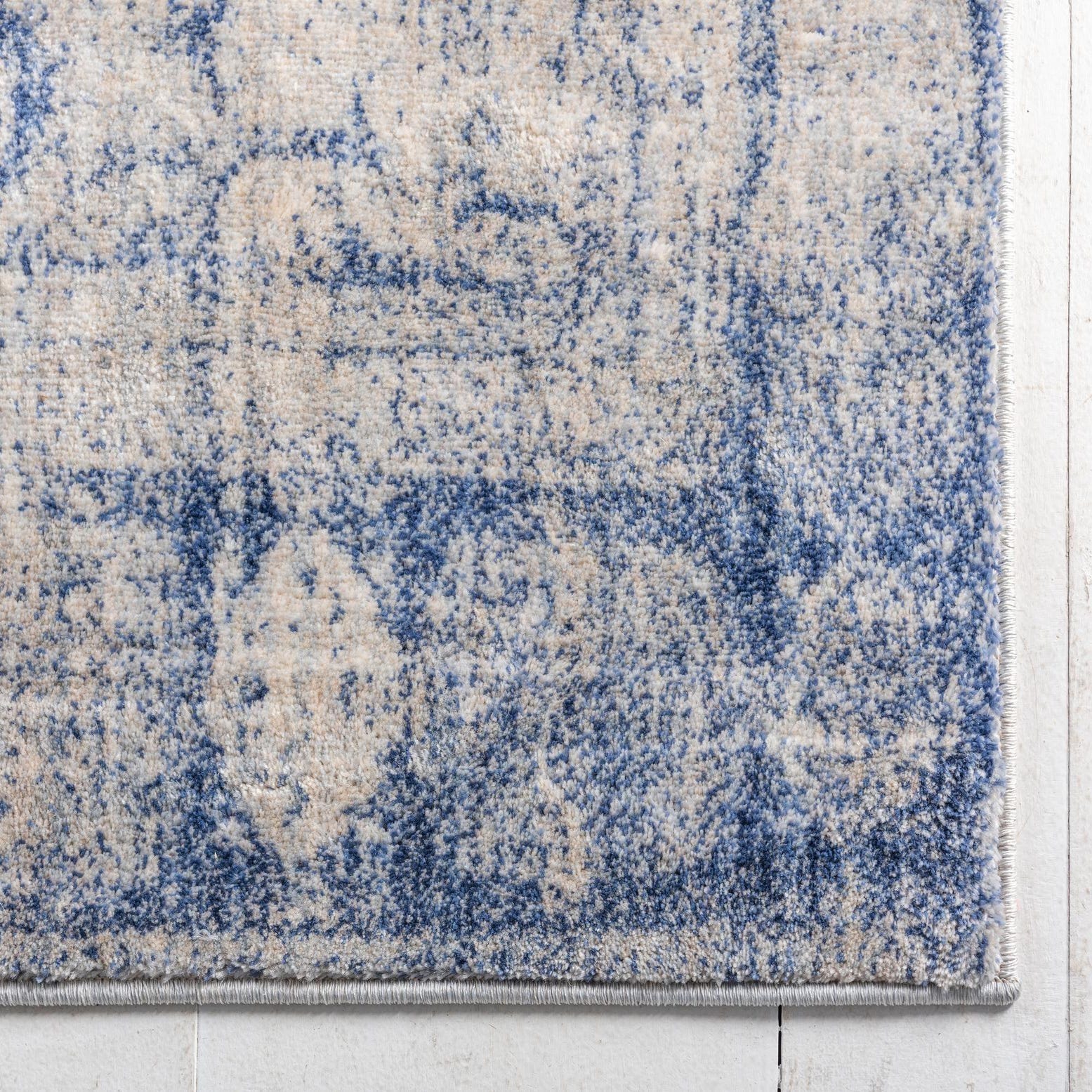 This machine-made runner is crafted from 100% polypropylene with space-dyed yarn for subtle color variation and a soft, low-pile feel underfoot. The design presents a distressed, vintage-inspired medallion pattern with softened edges and worn-in detailing. A navy blue background anchors the look while gray and beige accents layer across the field, giving depth and a gently mottled appearance. The space-dyed fibers produce a smooth, slightly velvety texture that feels comfortable to walk on and shows tonal shifts as light moves across the surface.
