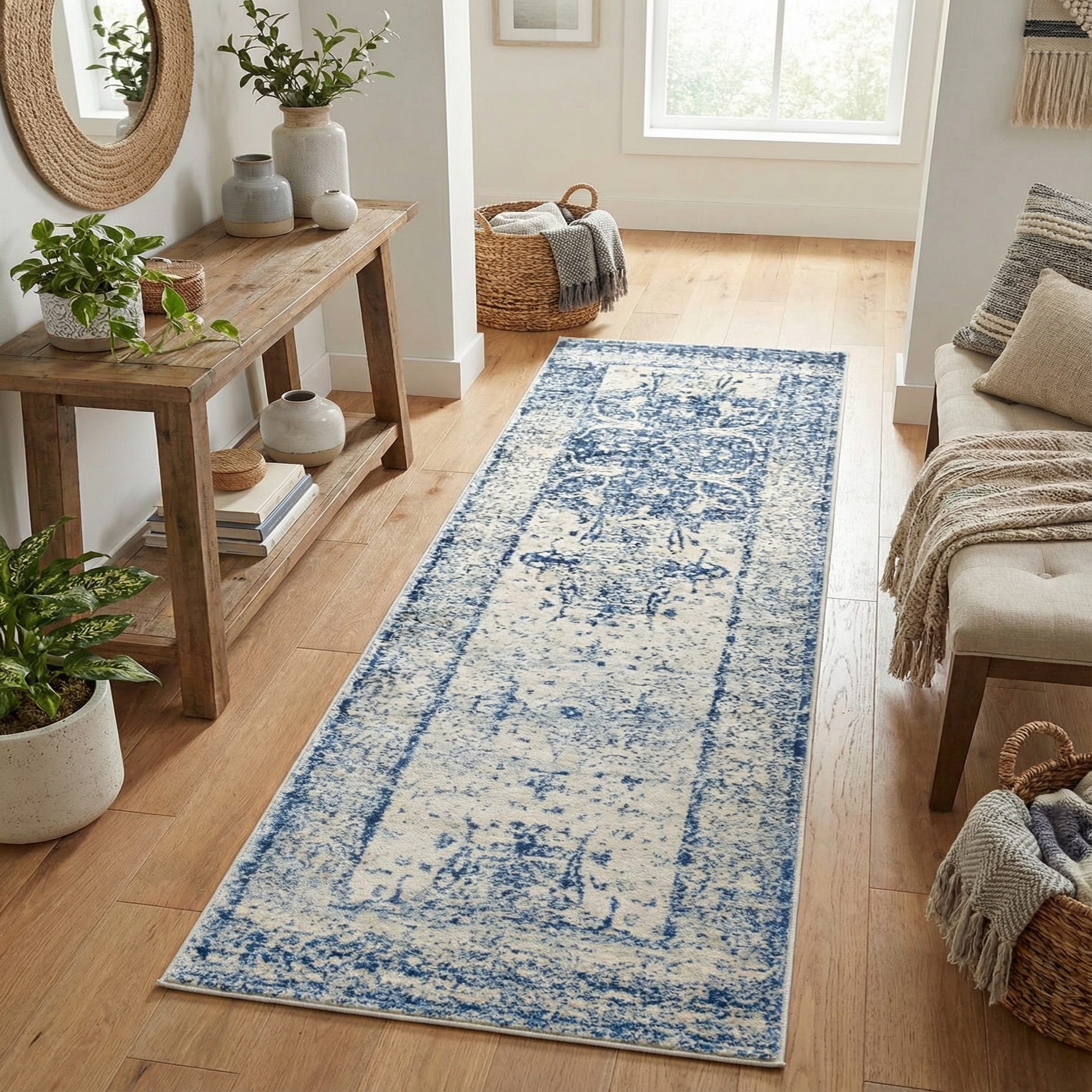 Set on a navy-blue background, this runner presents a softly distressed, vintage-inspired medallion pattern where beige, blue and light-blue tones float across the field. The design reads as an aged traditional motif with a worn border and subtle floral elements that create a layered, lived-in look. Space-dyed polypropylene yarn produces gentle variations in color, giving the pattern depth and a softly blurred edge that feels deliberate rather than uniform.