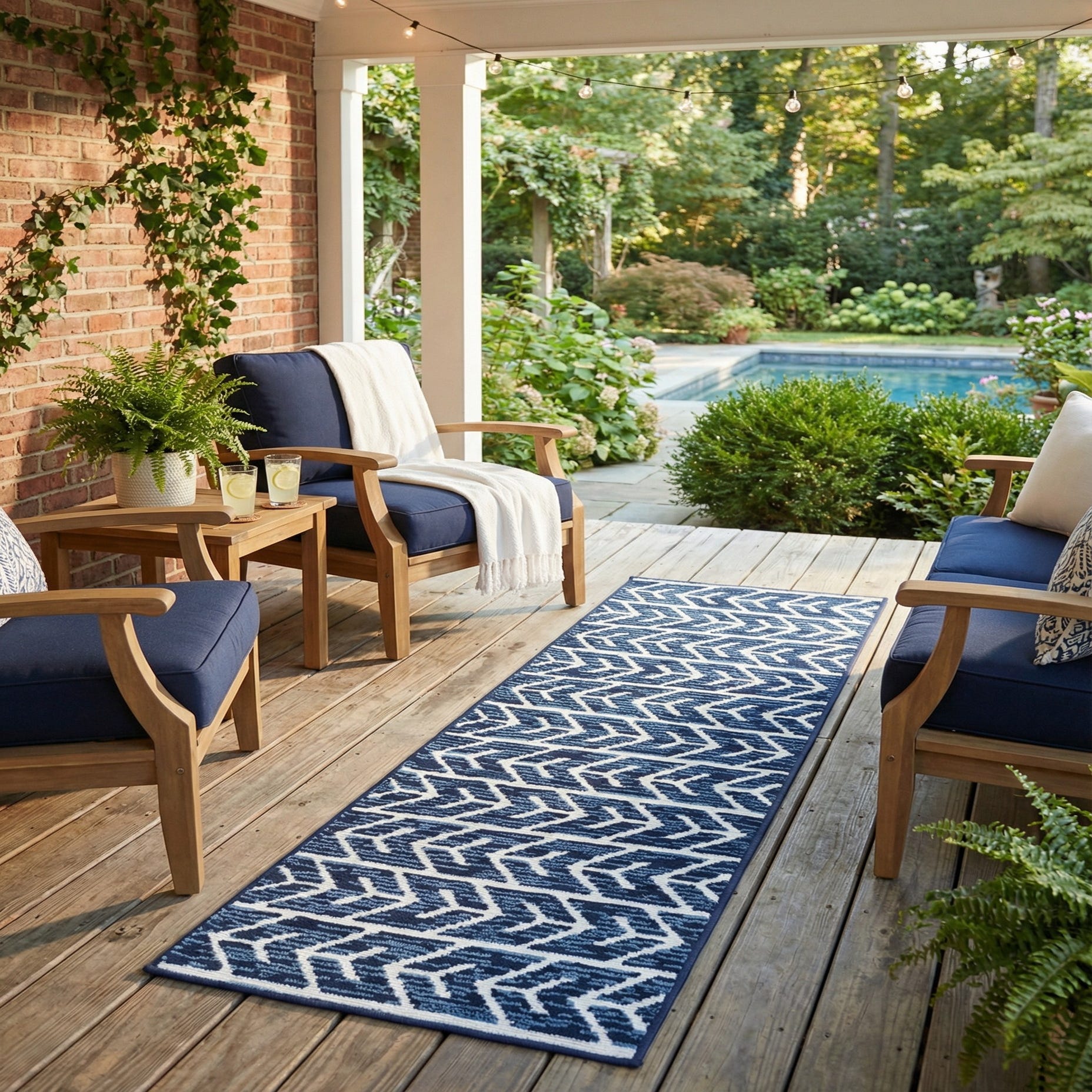 Well-suited to casual and transitional spaces, this runner brings a clean, nautical edge to entryways, hallways, or a galley kitchen, and holds up nicely on a covered porch, patio, or poolside corridor. Pair it with whitewashed or navy cabinetry and natural-fiber seating for a coastal scheme, or layer it with neutral upholstery and metal accents for a modern, relaxed look.