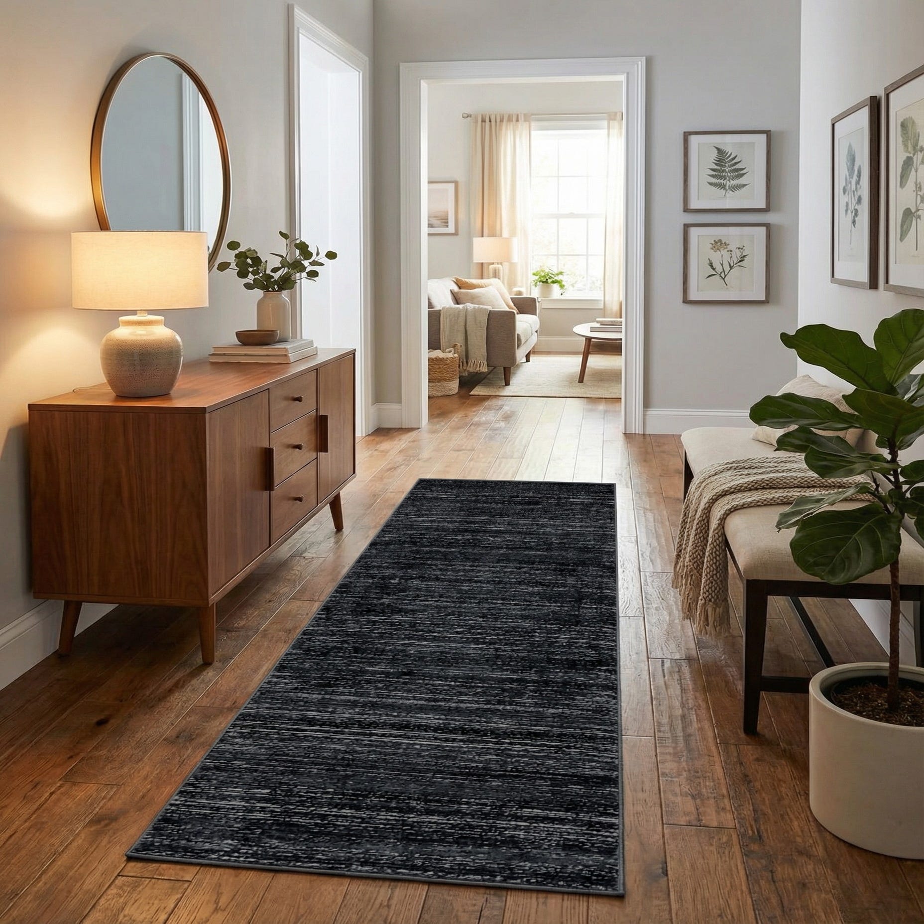 This runner works well in narrow traffic areas where you want to add color without overwhelming the space: hallways, entryways, or alongside a kitchen island. Pair it with light- or medium-toned wood floors for contrast, or layer it over a neutral tile to introduce depth. Its navy-and-ivory palette fits modern, transitional, and coastal-modern schemes—use it to ground metal and leather furnishings in an industrial loft or to tie together linen upholstery and brass accents in a contemporary living space.
