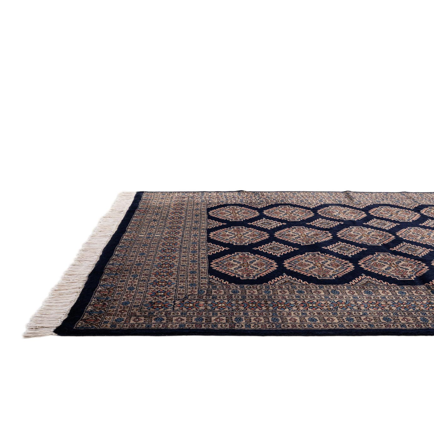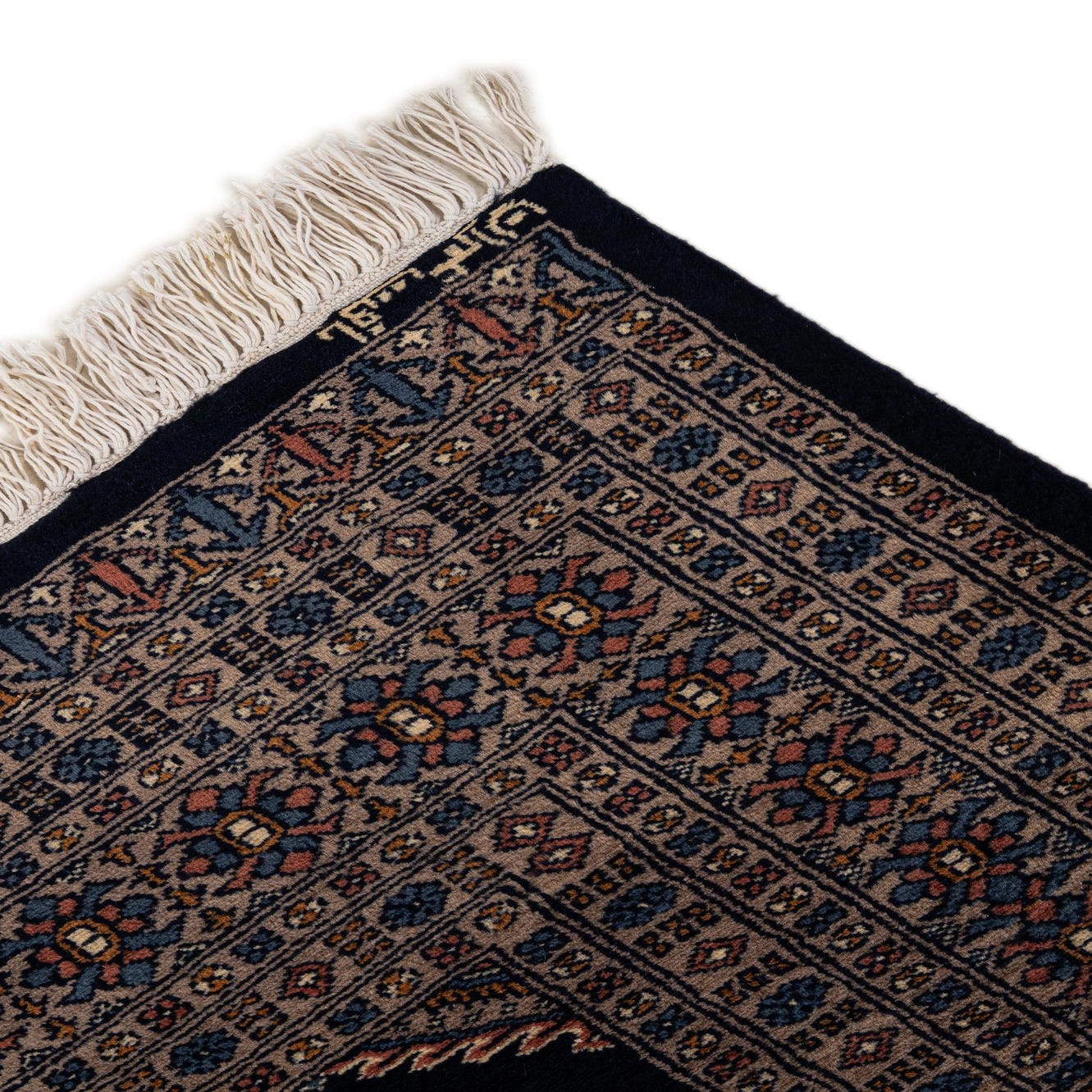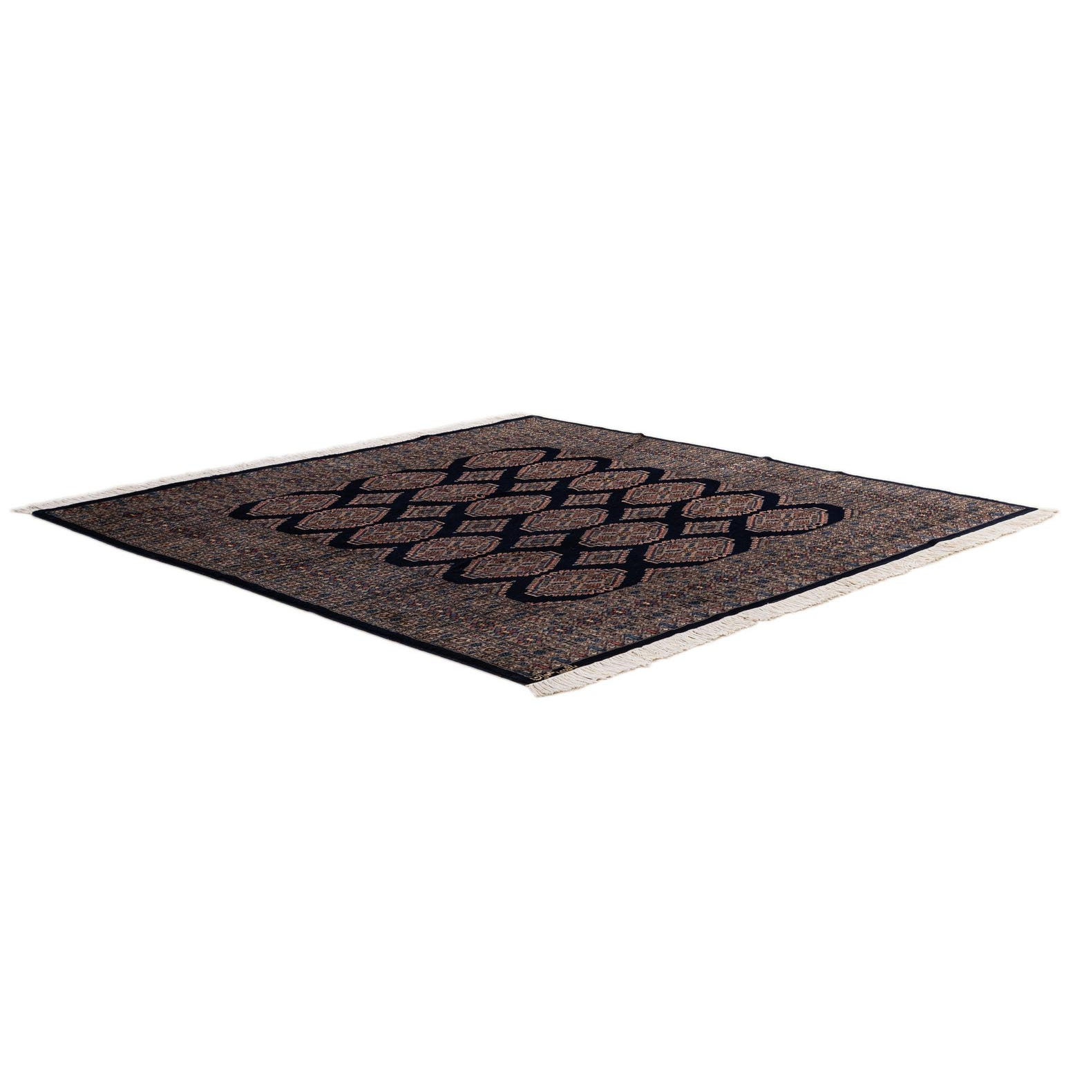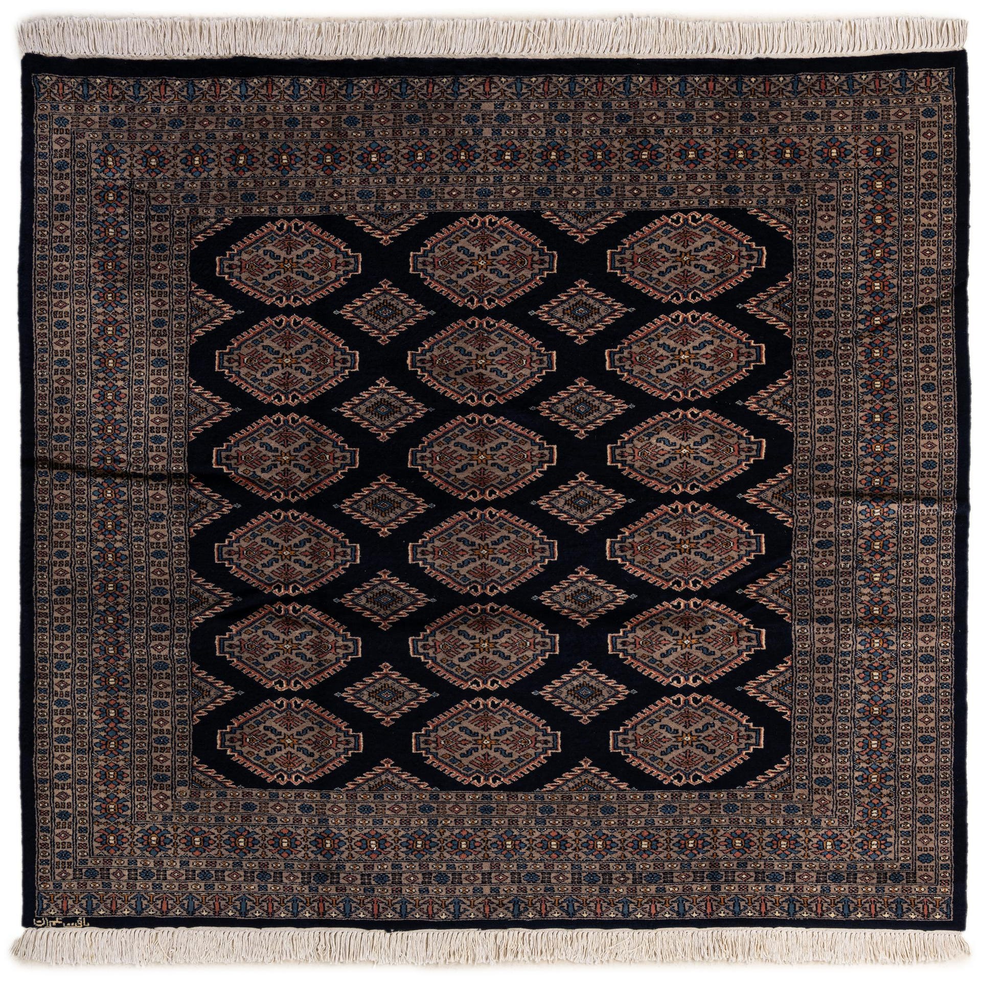 A 6' 4 x 6' 8 square navy blue Bokhara wool rug with traditional tribal patterns and white fringe.