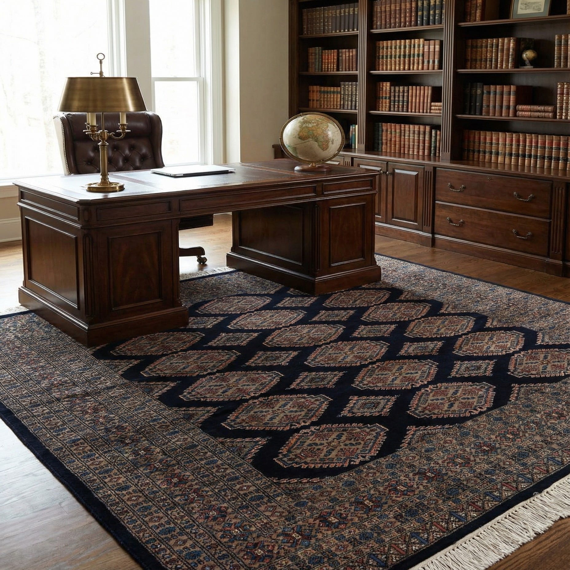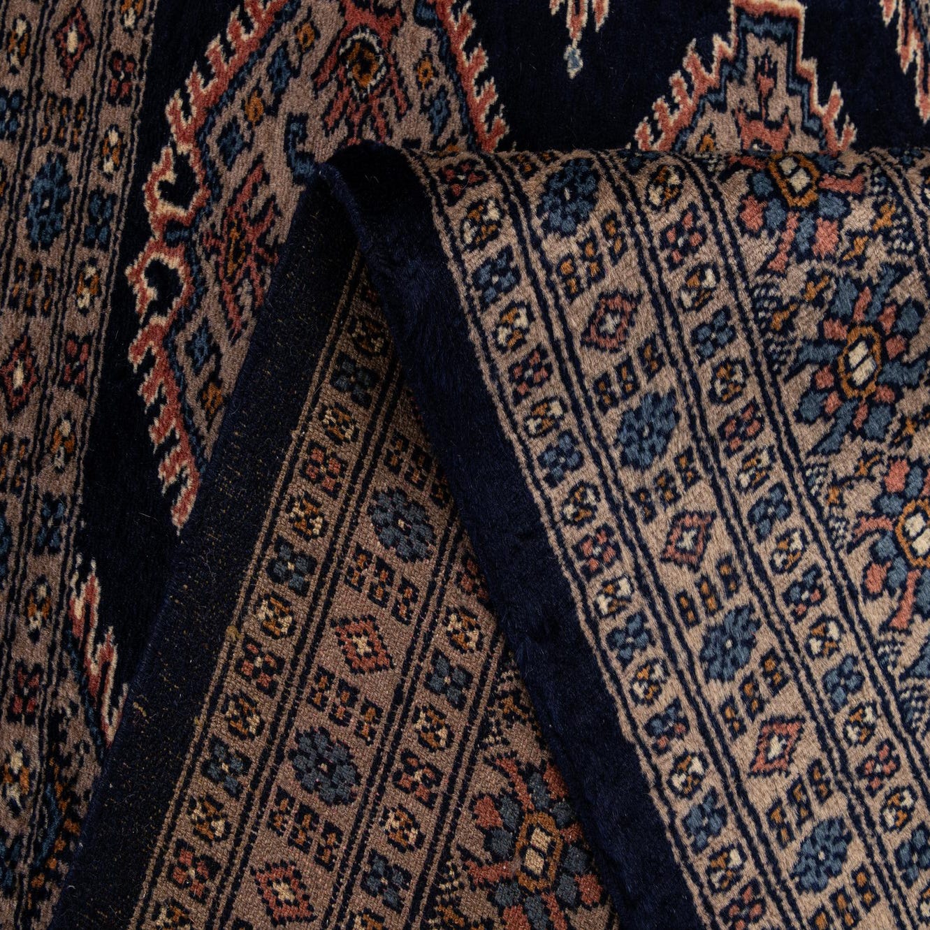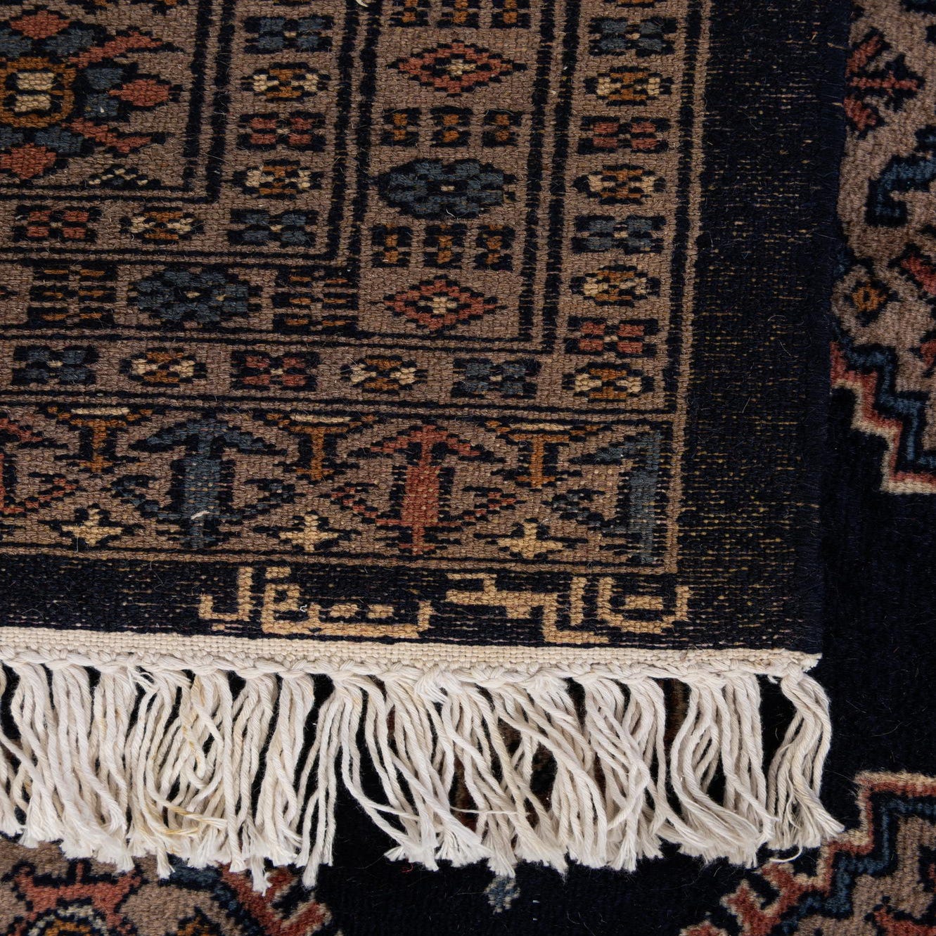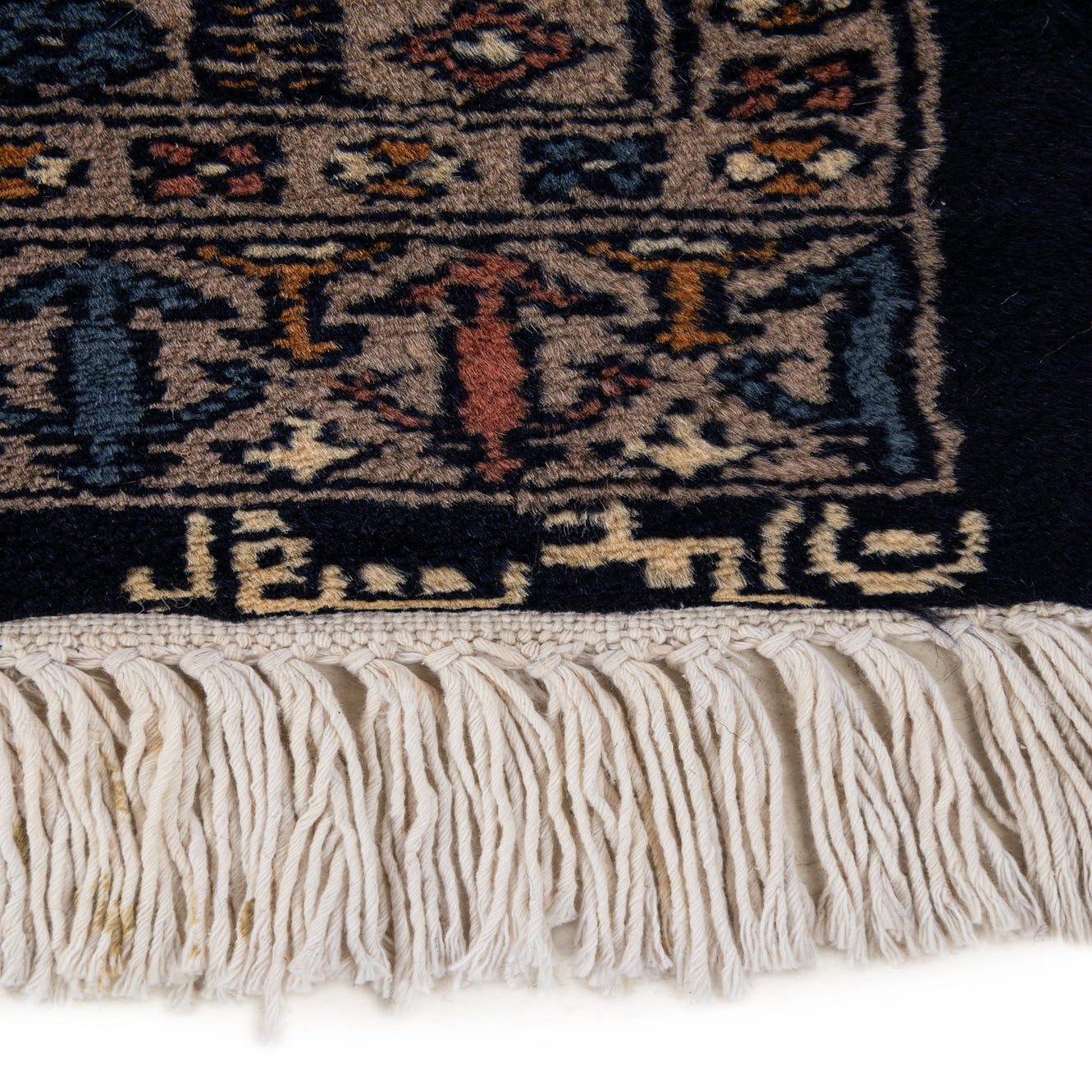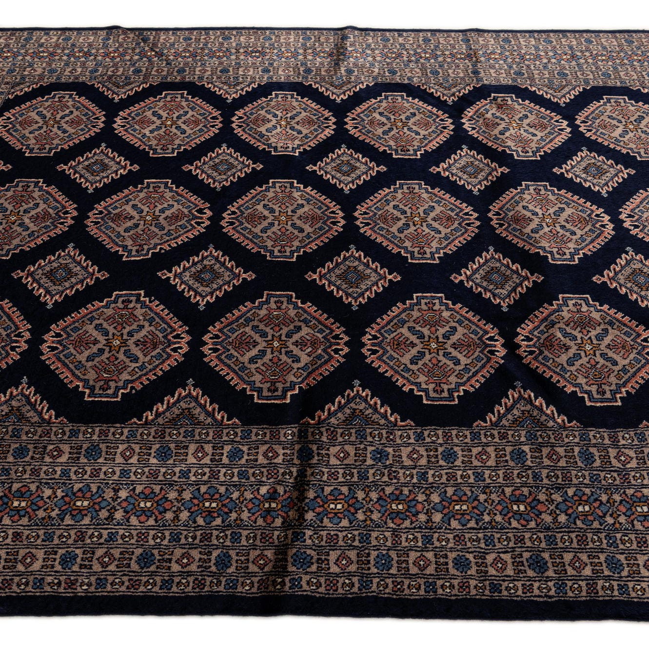 A 6' 4 x 6' 8 square navy blue Bokhara wool rug with traditional tribal patterns and white fringe.