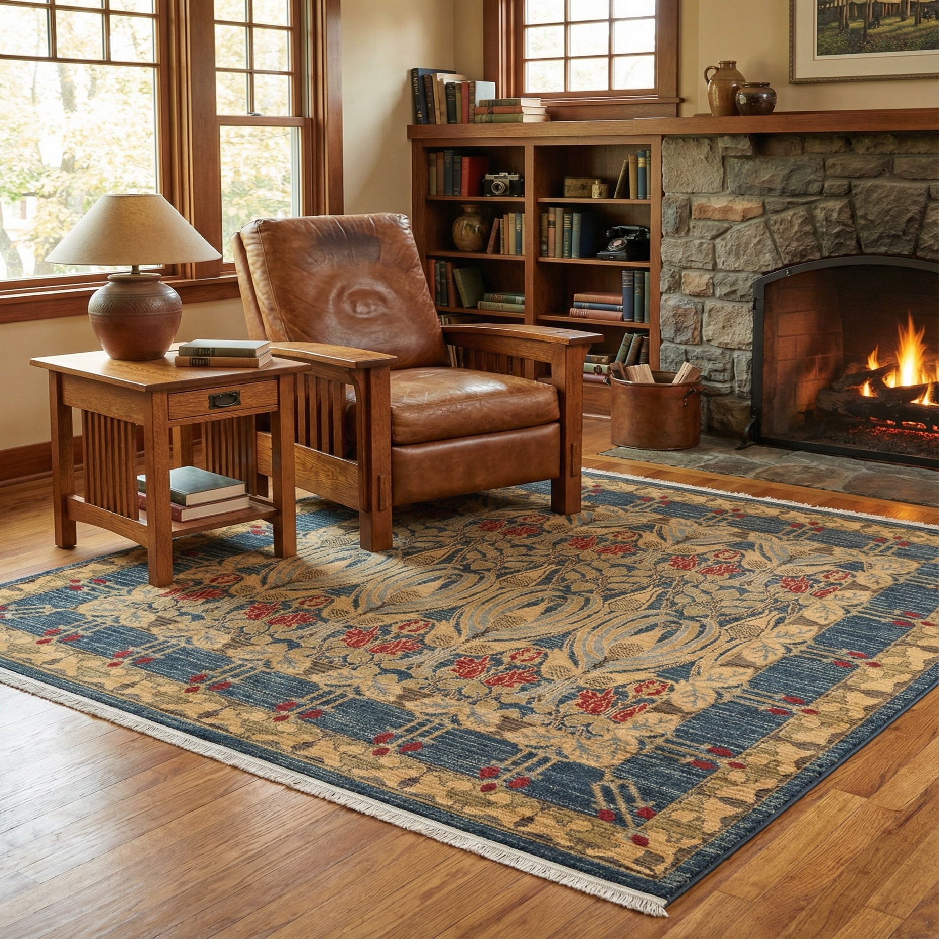 This rug pairs naturally with classic and transitional interiors — think a leather club chair and walnut side table, a neutral linen sofa with warm wood coffee table, or layered under a square dining table to define the space. It also complements rooms that mix brass or aged metal accents and textured upholstery, and it can ground a study, living room seating area, or a formal entry where a composed, patterned anchor is desired.