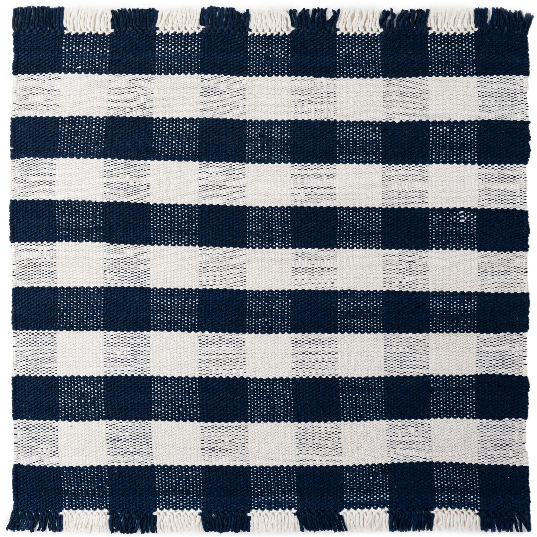 A 6'x6' square Eco Plaid rug featuring a bold navy blue and white checkerboard pattern with fringed edges, suitable for indoor or outdoor use.