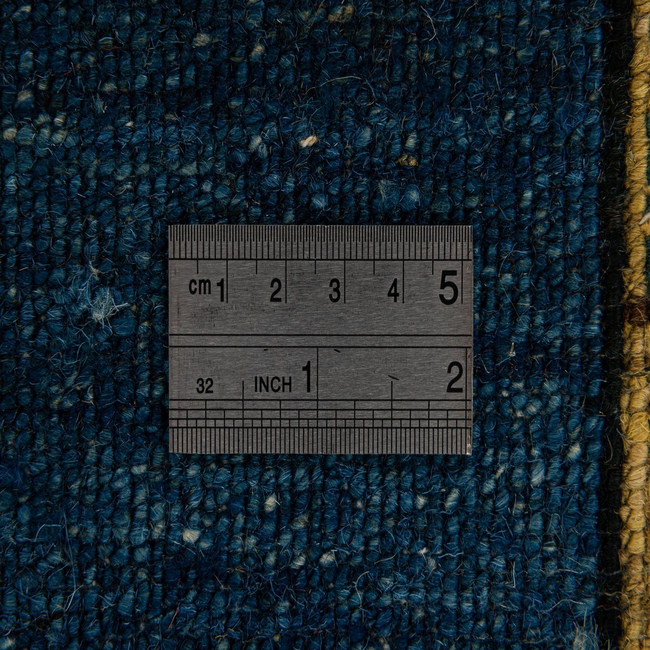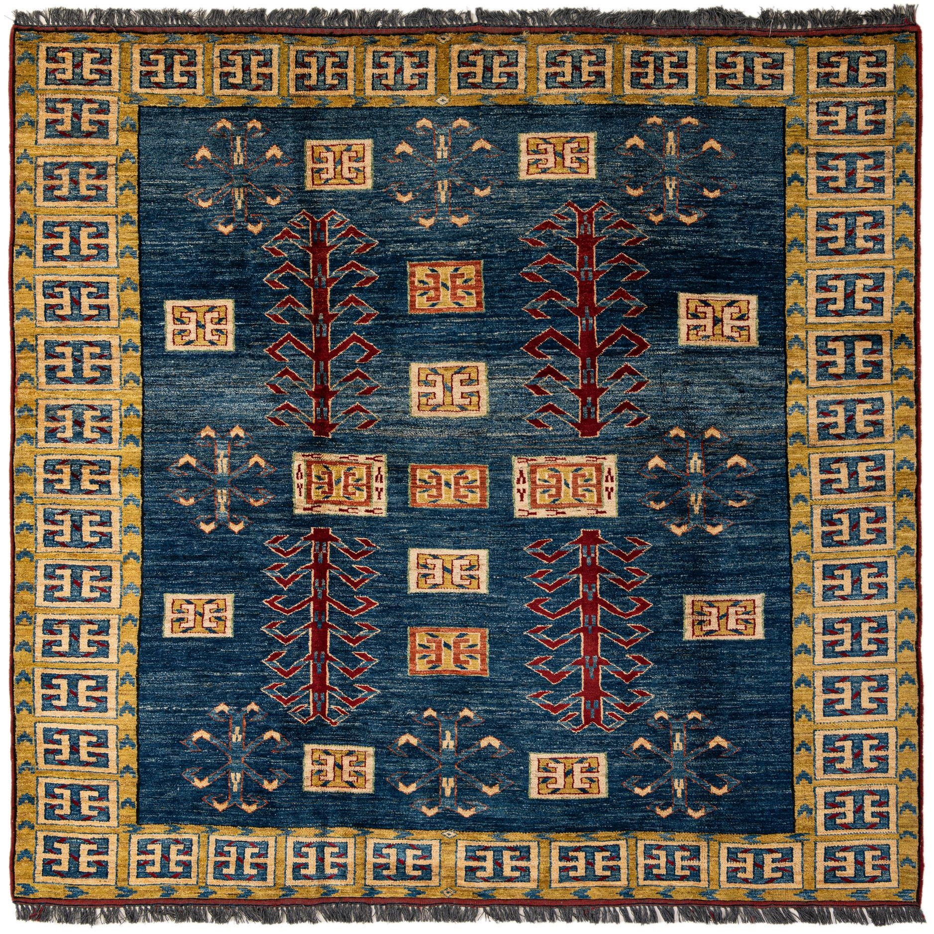 A deep navy field sets the stage for a pattern of strong, geometric motifs in warm, earthy tones. Vertical, tree-like forms in rich red punctuate the center, while small ivory-and-yellow square medallions and scattered floral motifs add rhythm across the surface. A golden-yellow border framed with repeating blue-and-ivory geometric blocks provides a crisp edge and visual contrast. Hand-knotted from 100% wool, the pile has a tactile, substantial feel with subtle tonal variations that give the surface depth and a handcrafted character. Finished fringed edges complete the look.