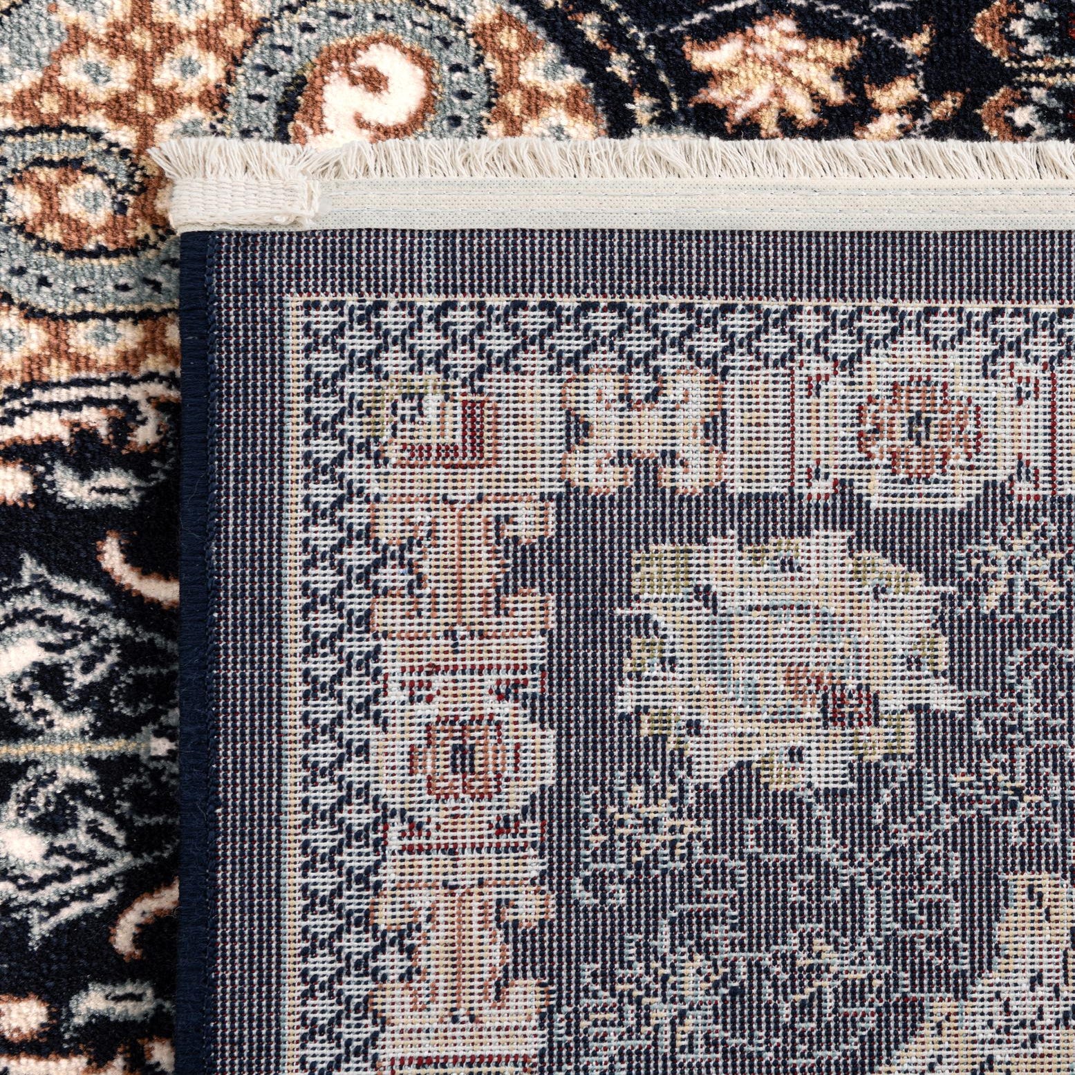 Primary color is Navy Blue. Colors in this rug include: Navy Blue, Blue, Burgundy, Cream, Green, Ivory, Plum Red, Tan.