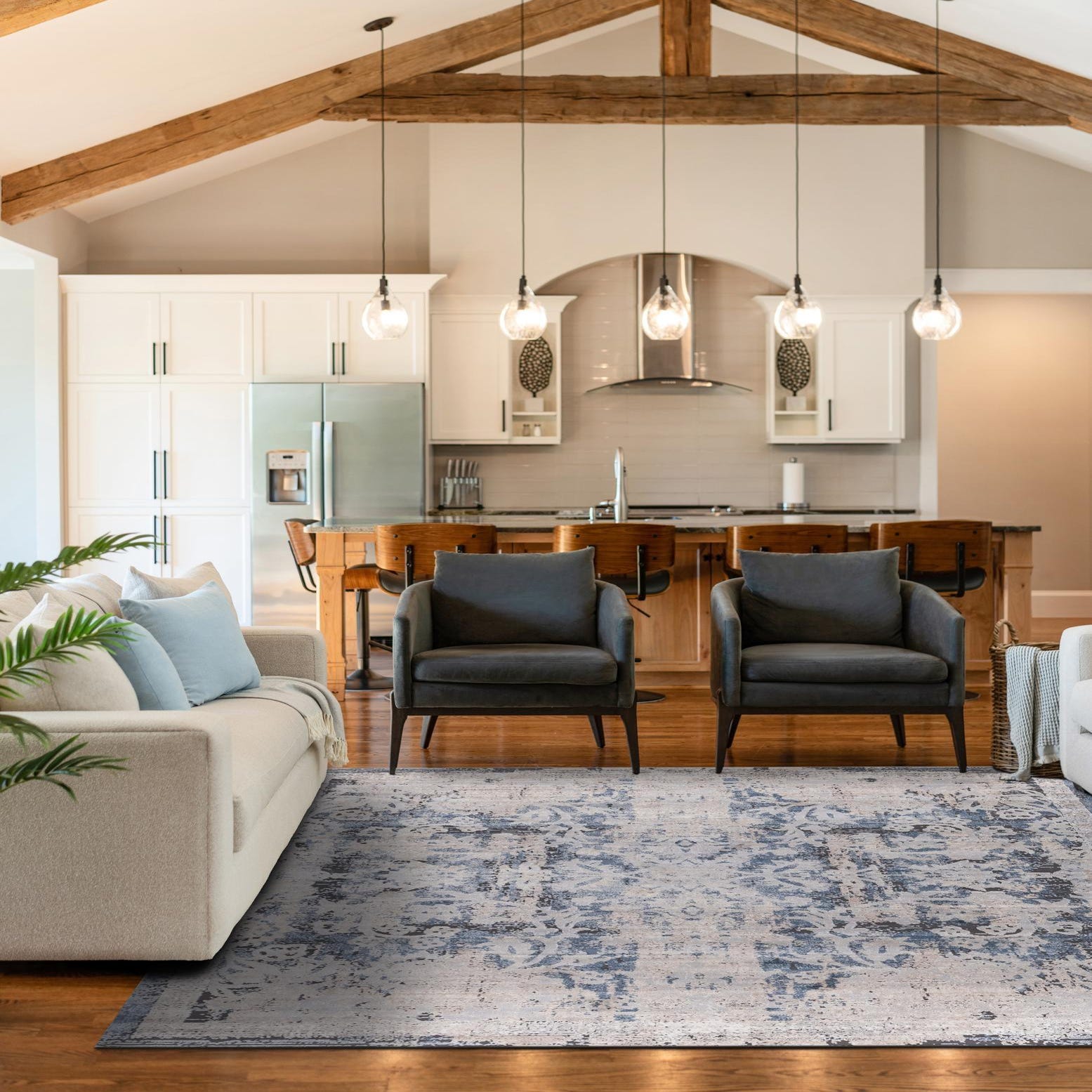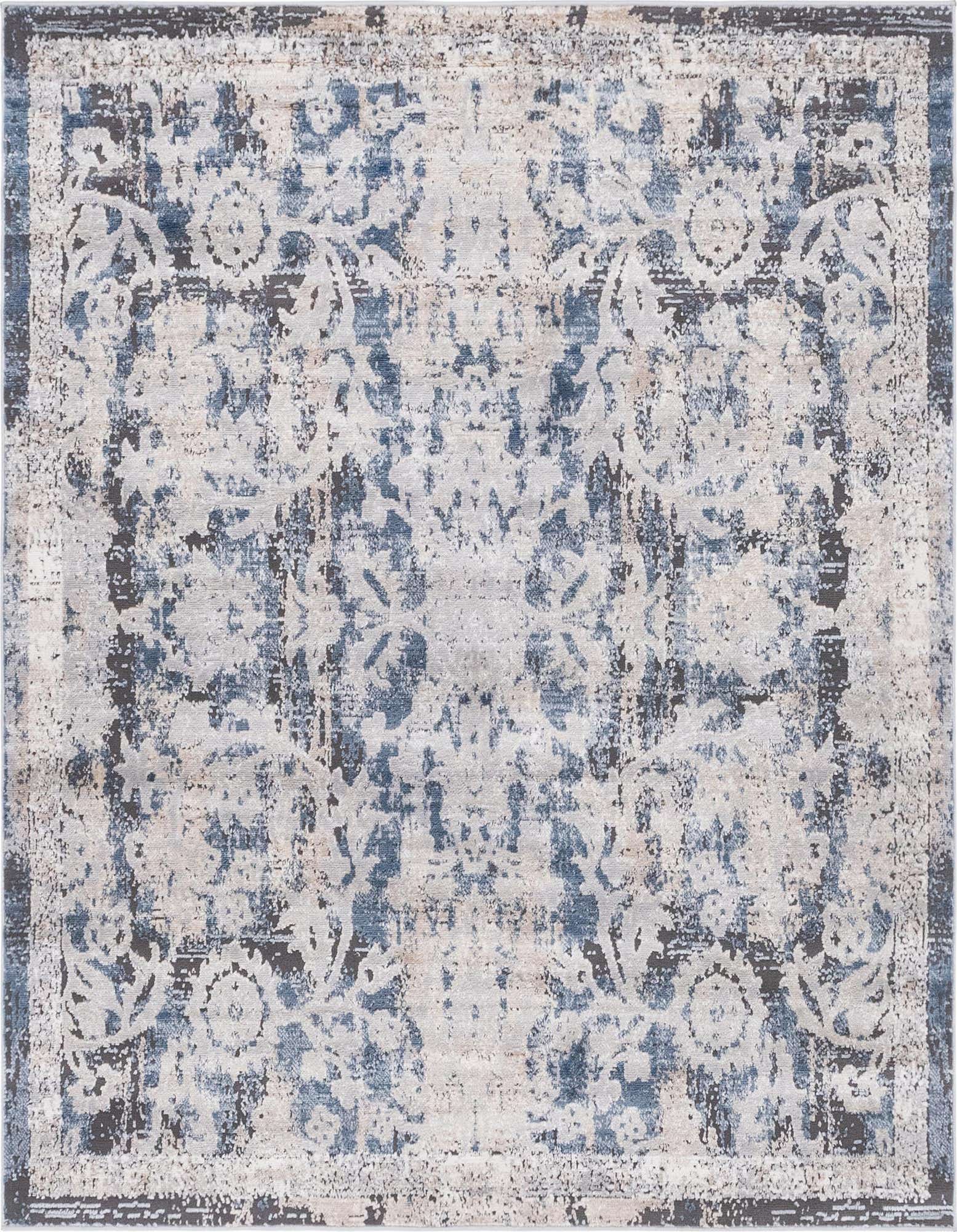 Primary color is Navy Blue. Colors in this rug include: Navy Blue, Beige, Gray, Ivory.