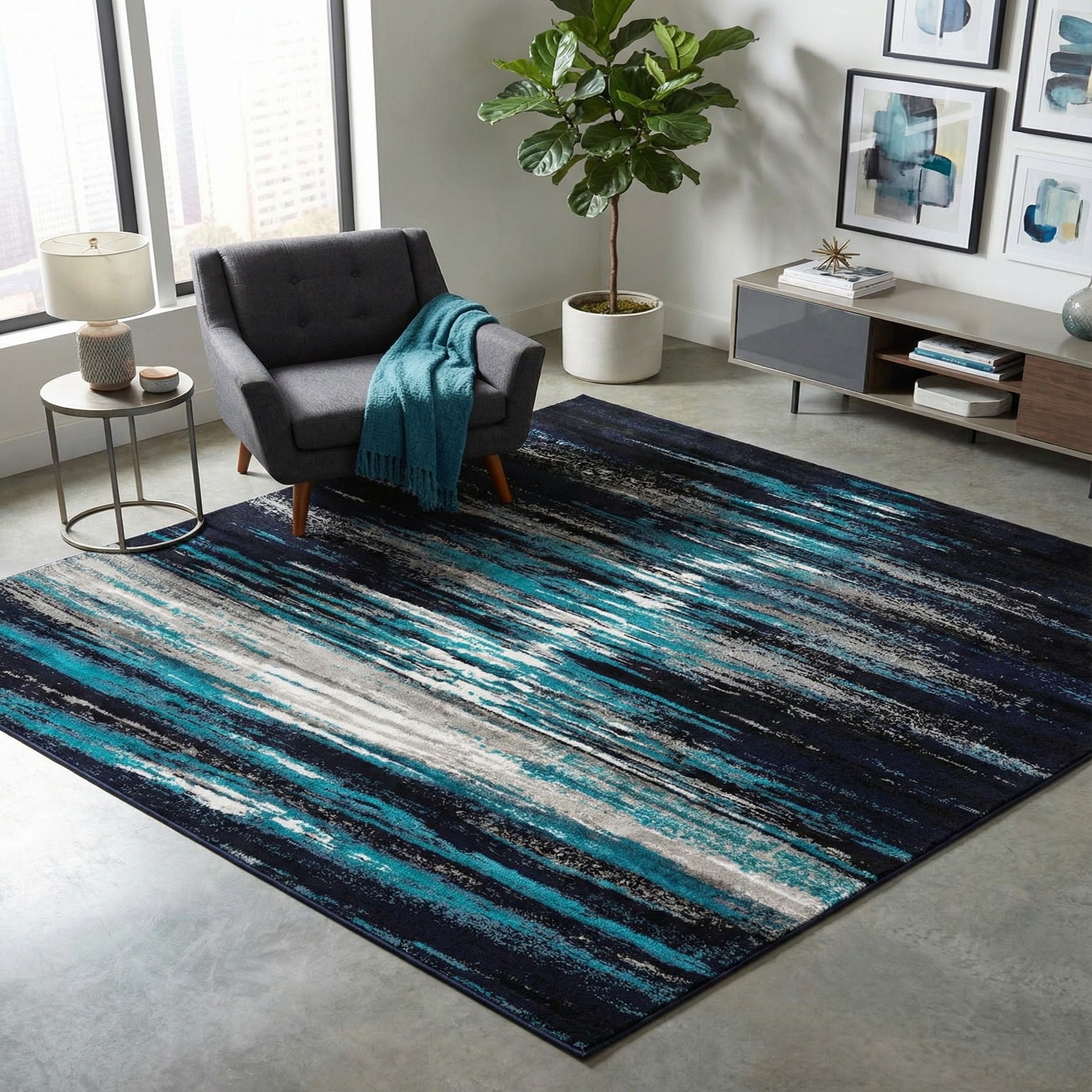 A deep navy blue field forms the backdrop for a painterly, horizontal-striated pattern rendered in turquoise, ivory, gray, beige and black. The design centers on a luminous band of turquoise and ivory that plays across the surface like reflected light, while scattered gray and beige flecks add dimensional contrast. Woven in 100% polypropylene, the rug has a low-profile, tightly packed pile with a smooth, slightly lustrous hand that keeps the colors crisp and the abstract motif well-defined underfoot.