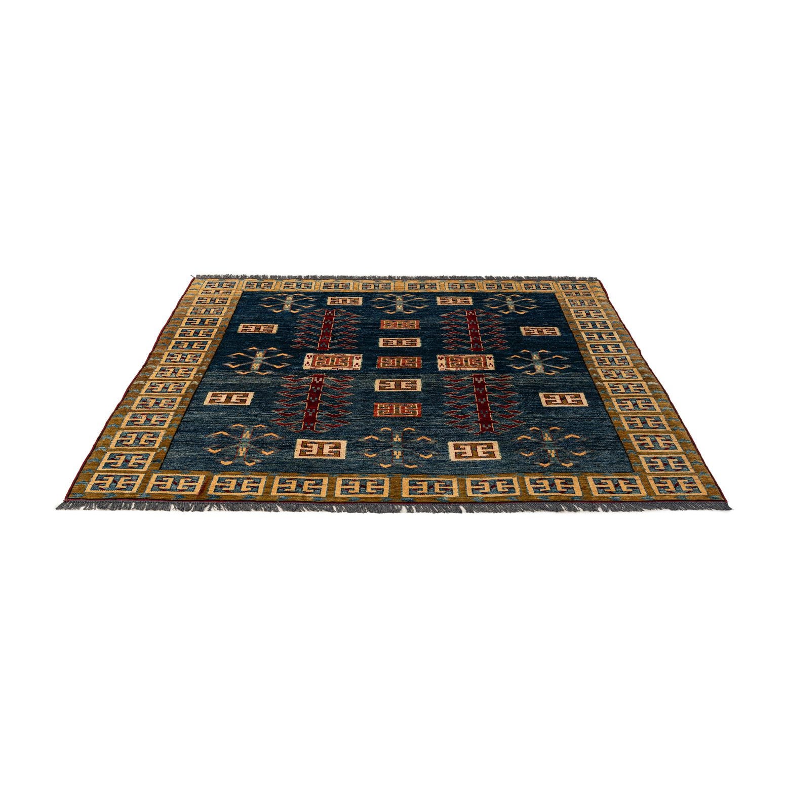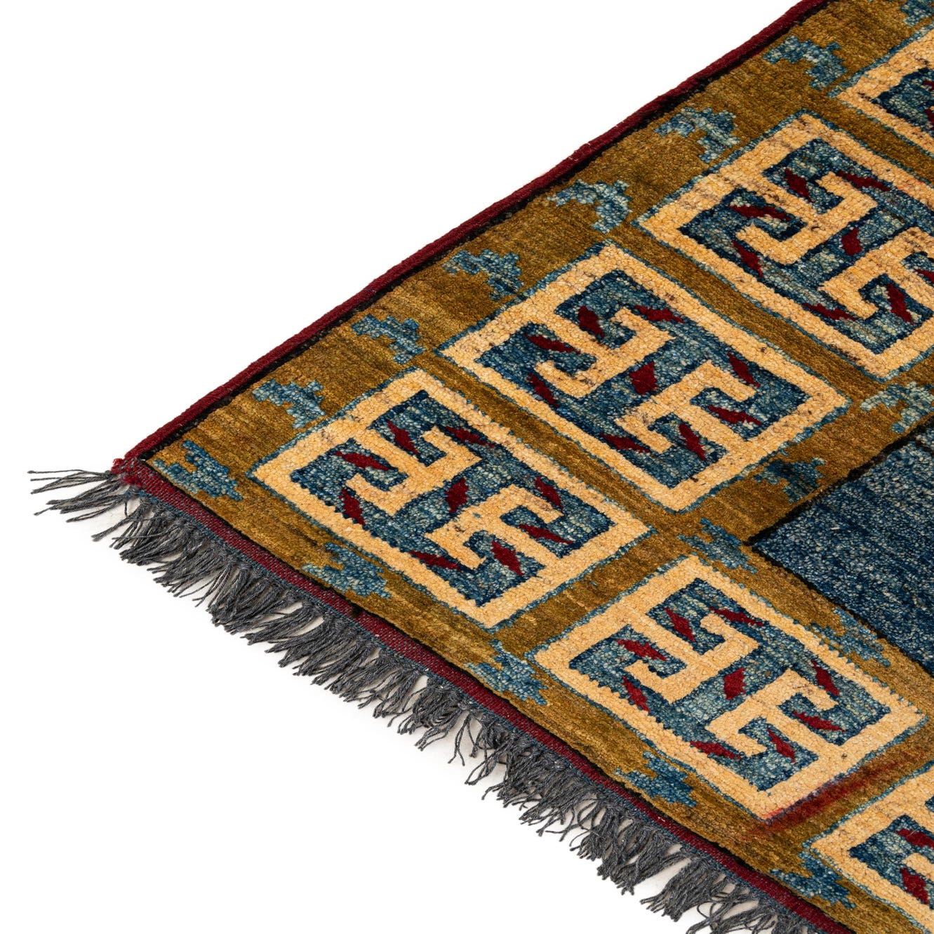 A 6' 3 x 6' 8 square navy blue wool rug with a modern oriental pattern and a gold geometric border.