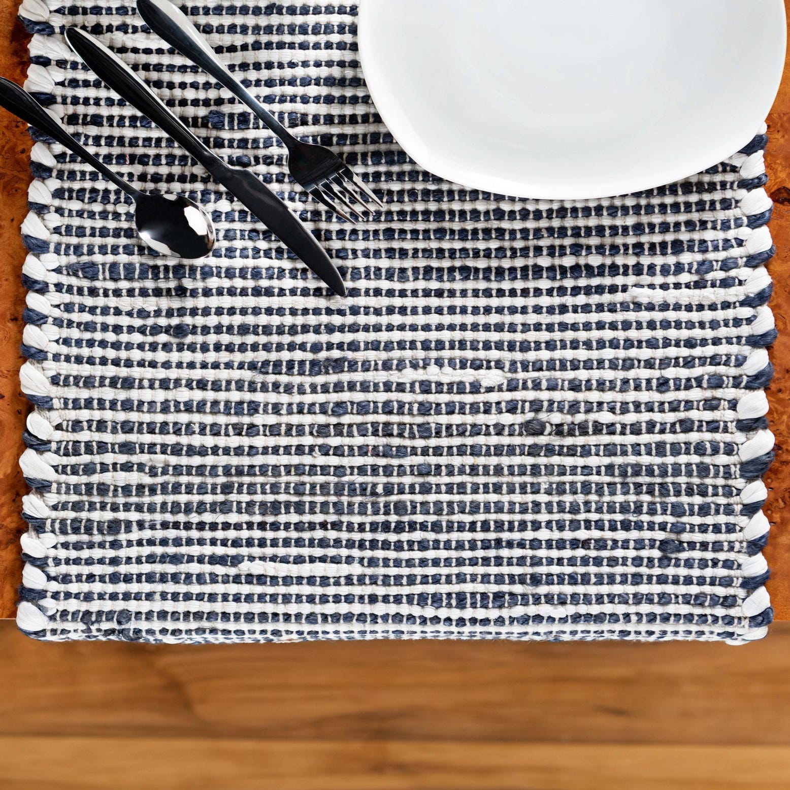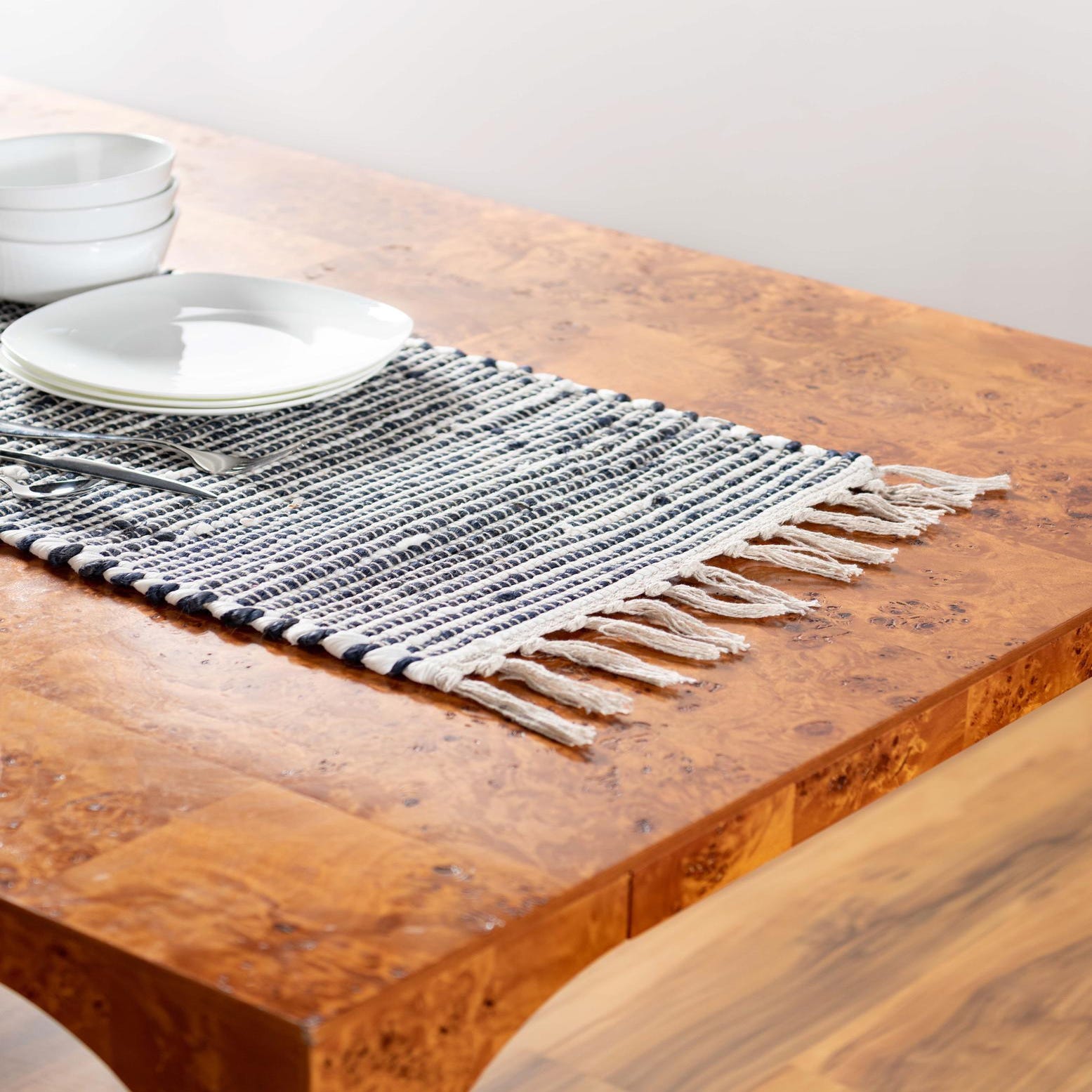 Hand woven of 60% cotton and 40% jute, this table runner pairs a deep navy blue background with narrow ivory stripes for a clean, linear look. The pattern is composed of tightly spaced, slightly irregular horizontal bands that create a subtle sense of movement across the piece. The flat, low-profile weave and knotted fringe on the short ends give the runner a relaxed, handcrafted feel.