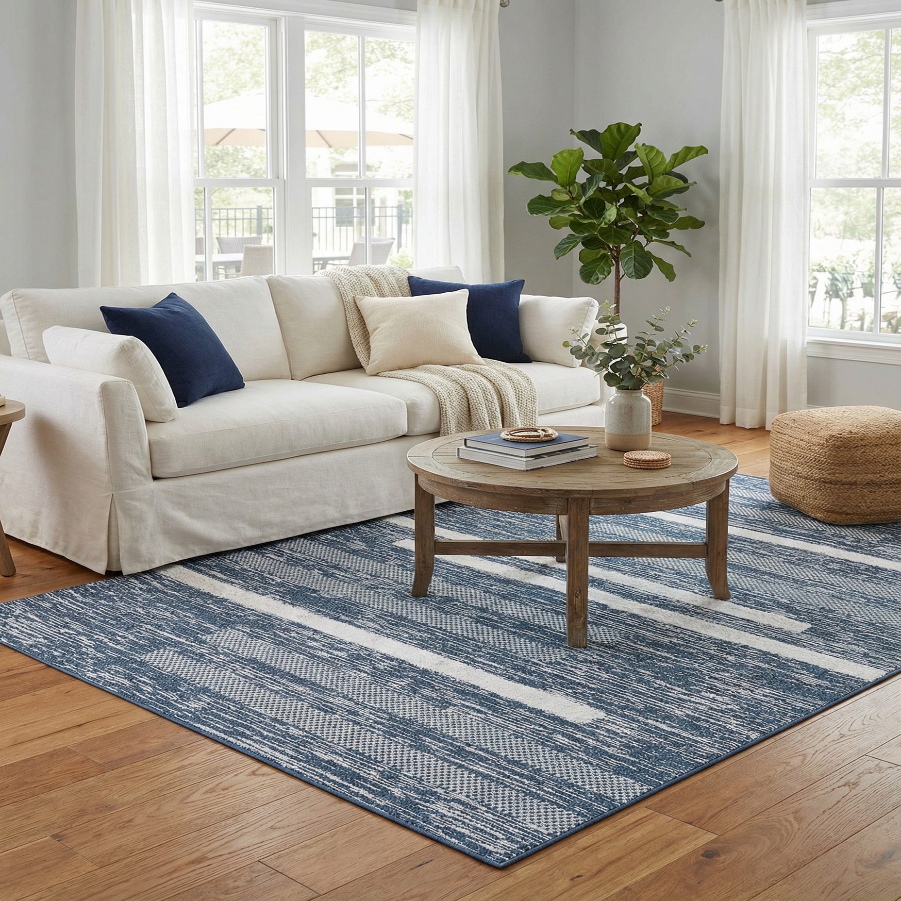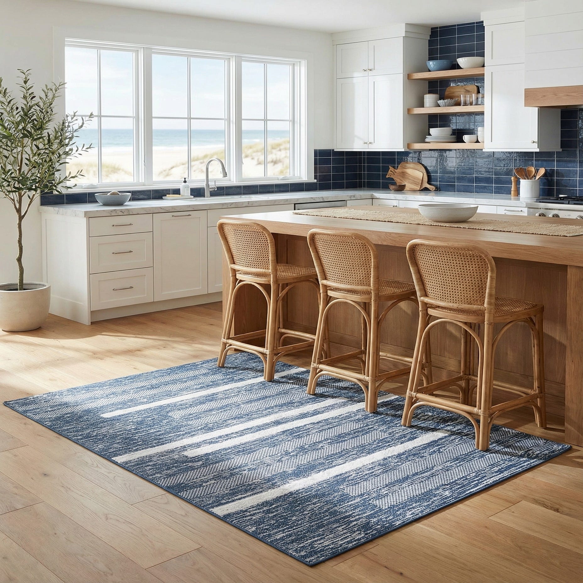 This contemporary piece is well-suited for a variety of interior design scenarios, from a minimalist setting seeking a touch of visual interest to a nautical-themed space where the navy hue can evoke a sense of coastal charm. It could also serve as an anchor in an eclectic living area, where its pattern can complement various decorative elements. This rug is a practical choice for high-traffic areas due to its durability and ease of maintenance, making it a functional addition to entryways, dining rooms, or home offices.