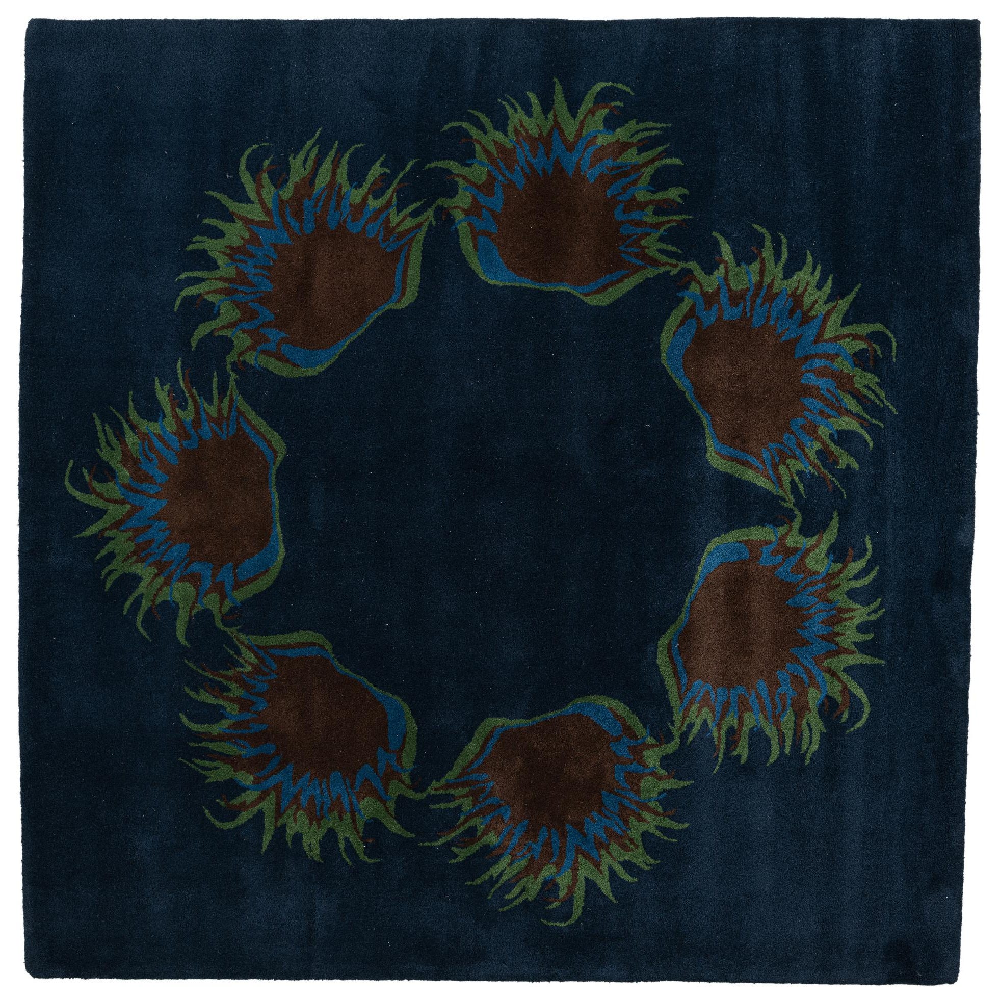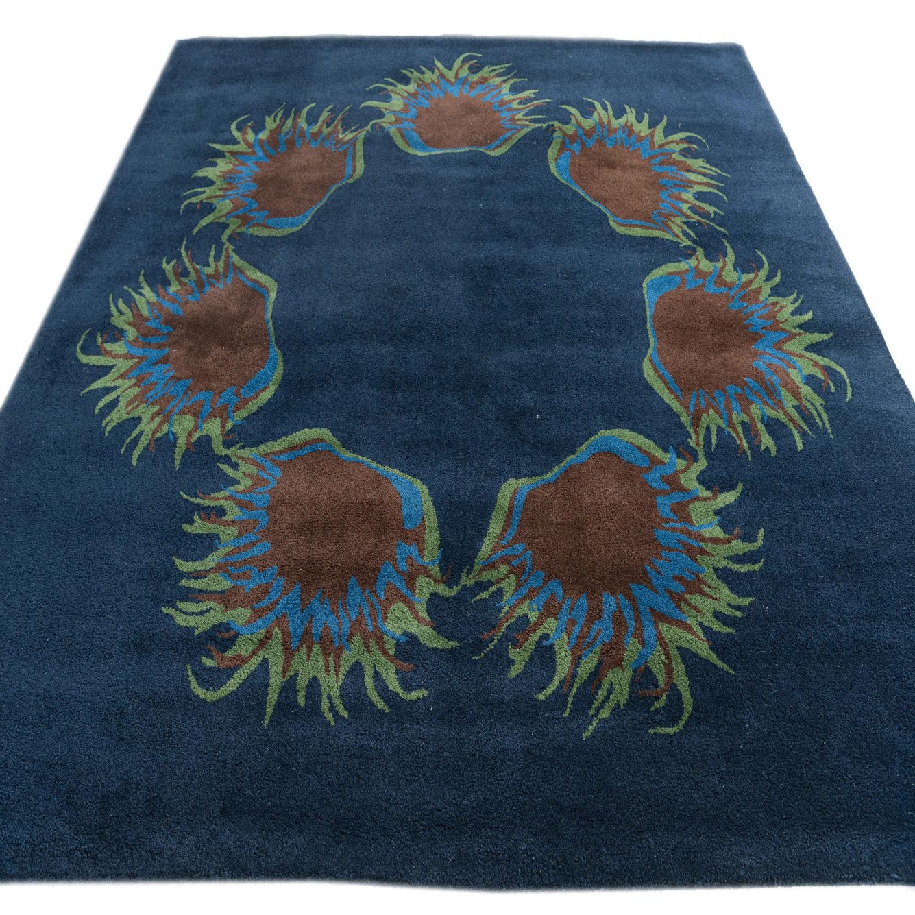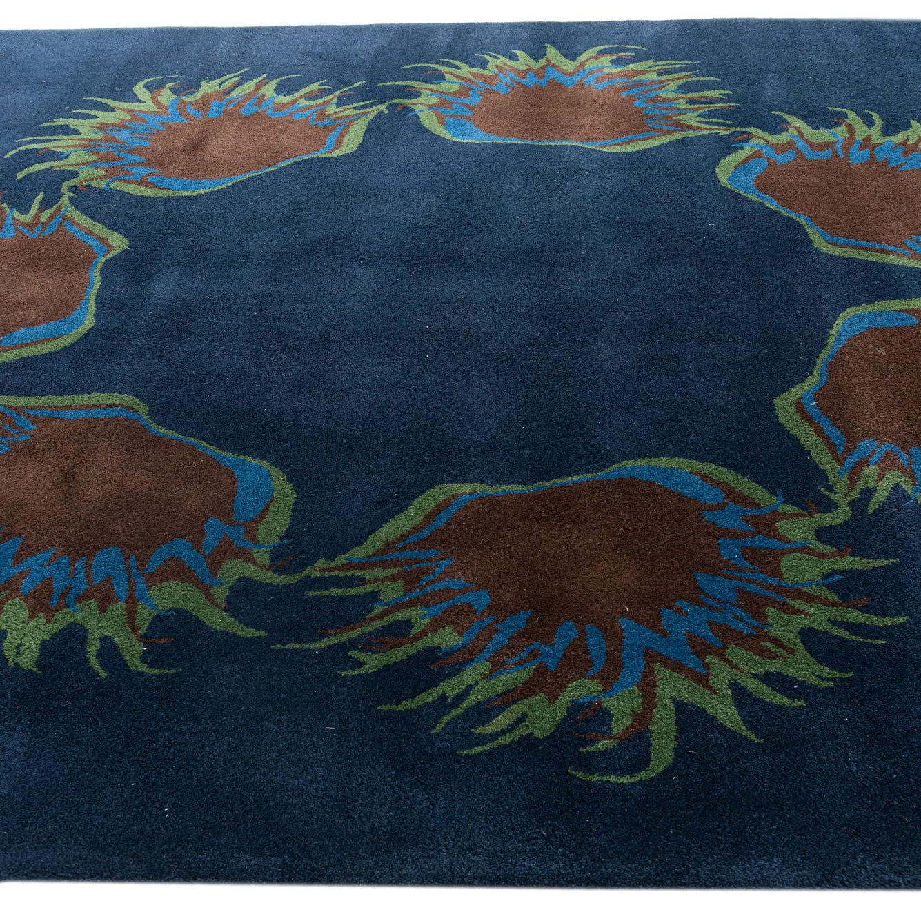 A 6x9 rectangular navy blue wool rug featuring a circular traditional pattern of brown, blue, and green floral motifs.