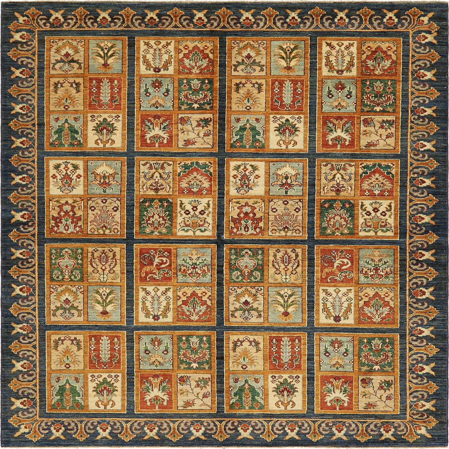 Primary color is Navy Blue. Colors in this rug include: Navy Blue, Blue, Cream, Green, Red, Salmon, Burgundy.