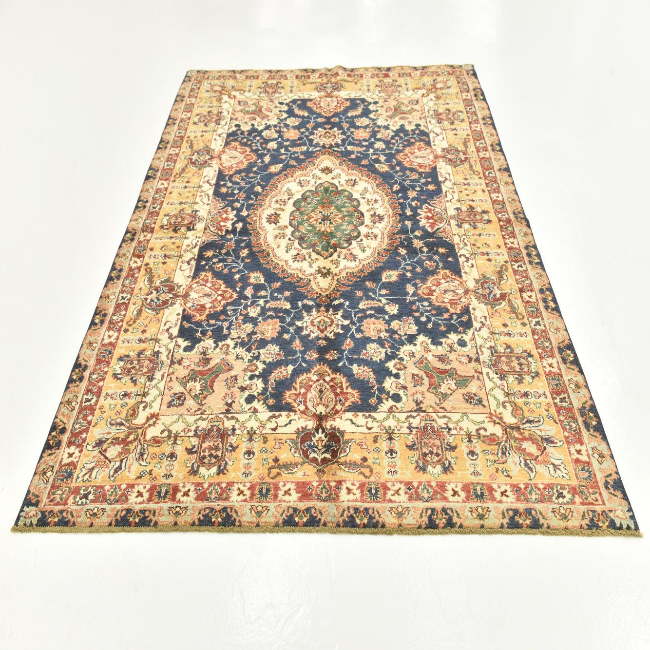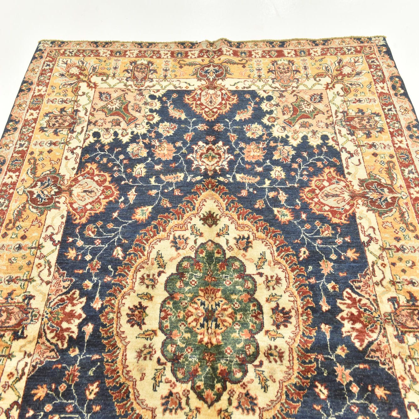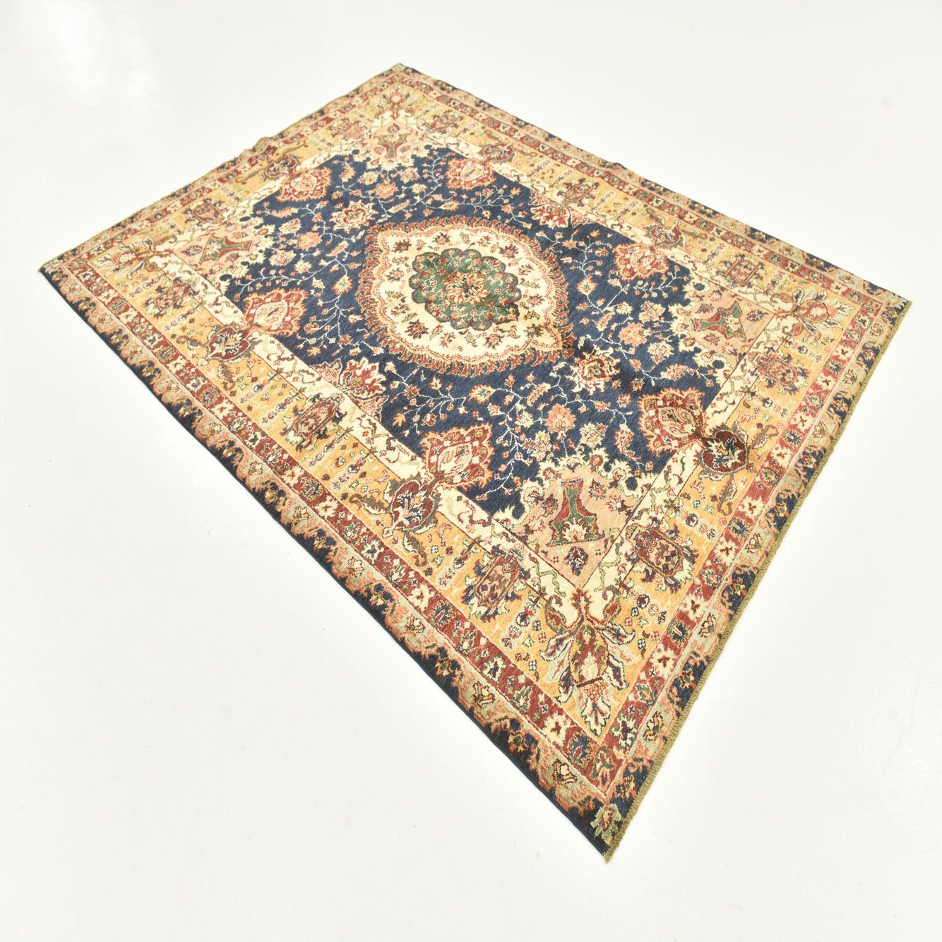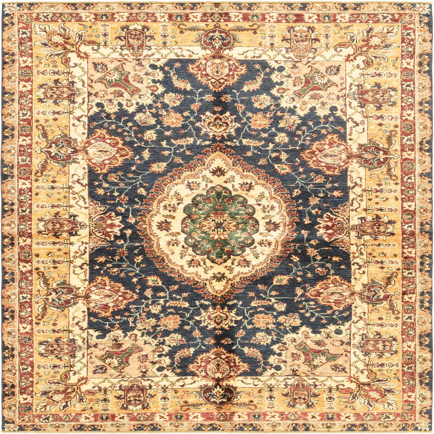 A classic medallion layout sits on a deep navy blue ground, surrounded by a warm beige and gold guard border that highlights the rug’s detailed floral vines and palmette motifs. The central medallion combines green and puce tones with beige accents, while touches of red, brown and lighter blues thread through the field to create layered color and movement. Hand knotted from 100% hand-spun wool, the pile has a dense, slightly varied texture that feels warm and substantial underfoot and gives the surface a soft, tactile nap with subtle tonal variations.