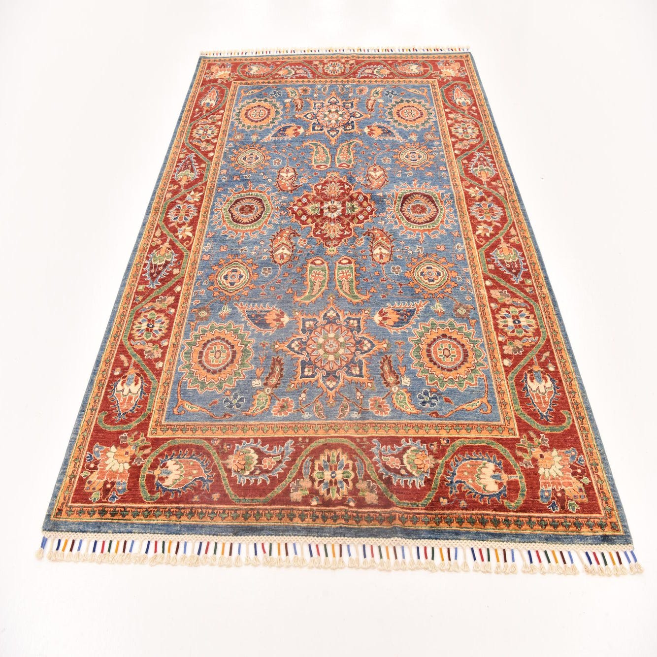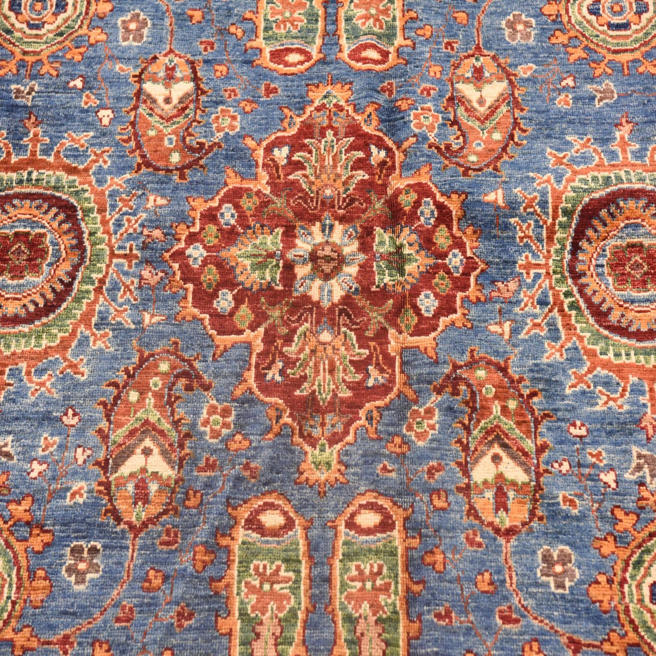 The Ariana Ziegler collection presents this 6x9 hand-knotted rug crafted from 100% hand-spun wool, which offers a robust texture and enduring durability. Highlighted by a rich navy blue background, this rug features a traditional pattern with an intricate array of floral and geometric motifs. The color palette includes deep shades of navy blue, black, and hunter green, complemented by warmer tones of maroon, orange, red, and brown, creating a balanced yet dynamic visual experience.