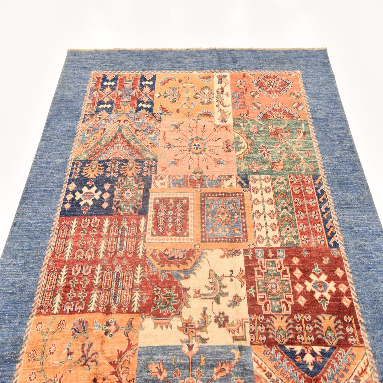 The Ariana Ziegler collection presents a meticulously crafted 6x9 hand-knotted rug made from 100% hand-spun wool. This rug displays a diverse patchwork of traditional motifs, encapsulated within a navy blue border that ties together the design narrative. Its varied palette includes complementary shades of navy blue, black, blue, cream, green, olive, orange, red, maroon, and peach, set against a dominant navy blue background.