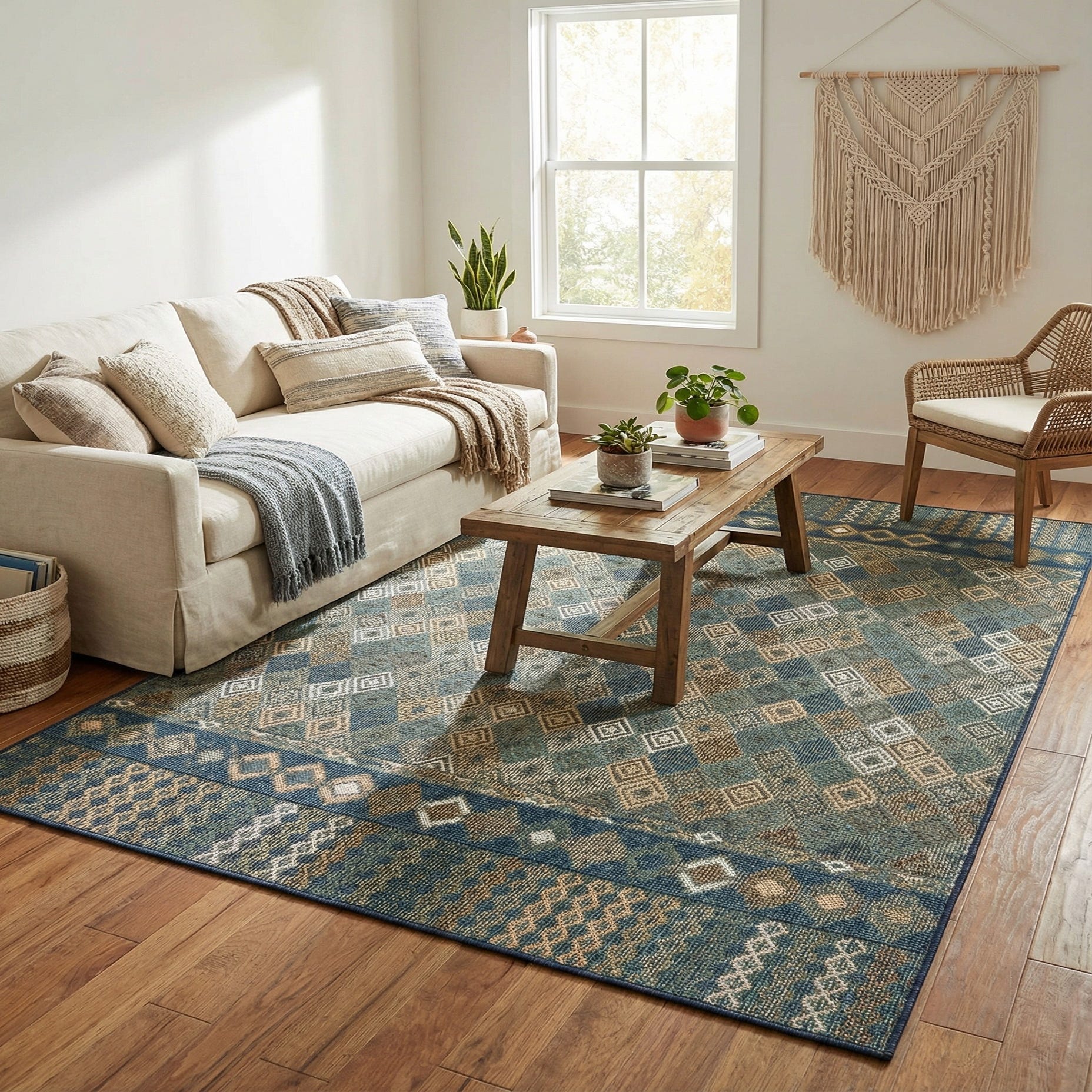 The rug’s earthy palette and geometric motifs work well with casual coastal, bohemian, or modern farmhouse interiors. Use it to define a covered patio seating area, ground an entryway with natural wood and rattan furnishings, or add patterned interest beneath a sunroom coffee table. The mix of navy, ivory and warm accent tones pairs easily with leather, wicker, teak and muted upholstery.