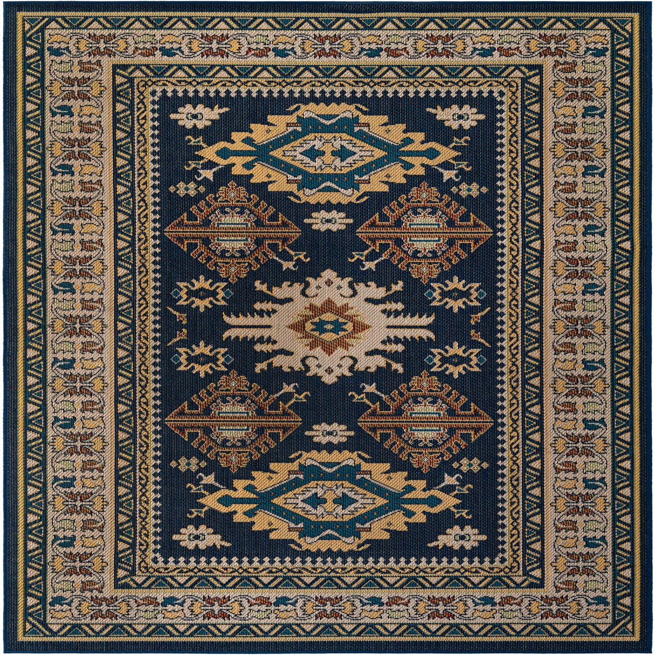 This piece works well on a covered porch or sunroom, layered beneath a casual dining table, or anchored beneath a sofa and coffee table in a living area. It pairs naturally with light woods, wicker or rattan furnishings and complements coastal, transitional, modern farmhouse or global-inspired interiors where bold navy and warm accent tones add contrast and depth.