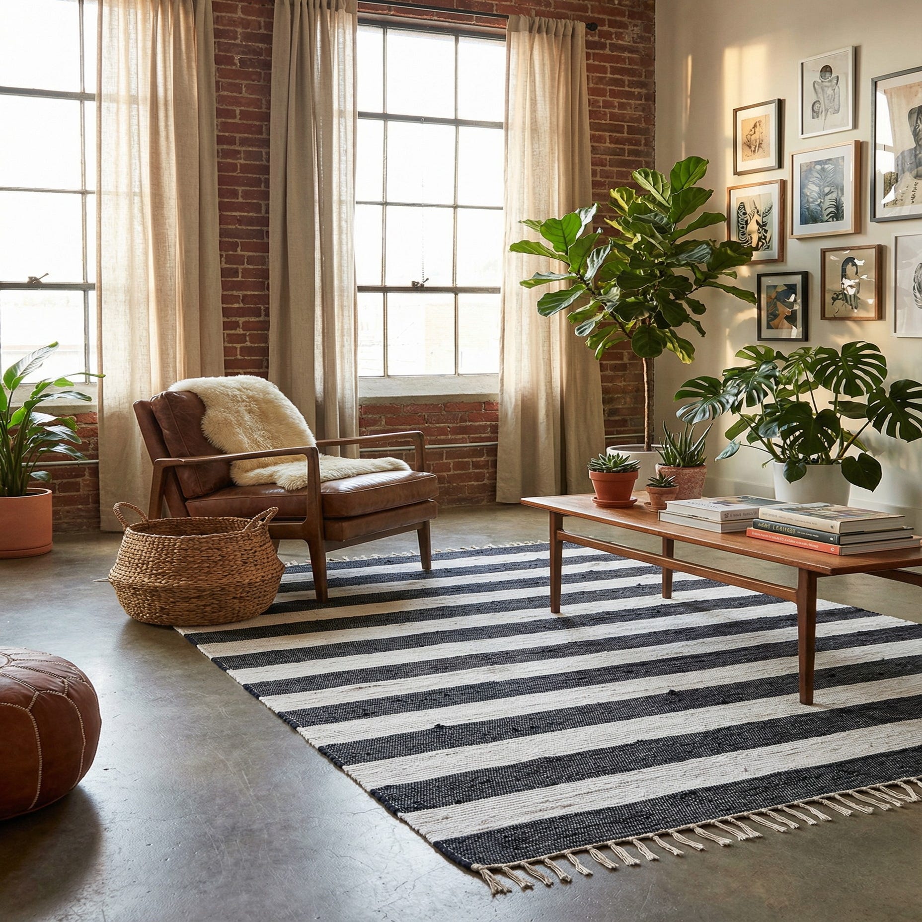 The surface is low-profile and slightly textured, so it feels soft underfoot while showing subtle irregularities from the hand-weaving that add visual interest. It works well in busy areas—an entry, kitchen, or layered in a living room—and pairs naturally with light woods, crisp white linens, and matte black or brass accents. Use it to ground a seating area, run beneath a dining table, or bring a tailored yet relaxed look to a bedroom.