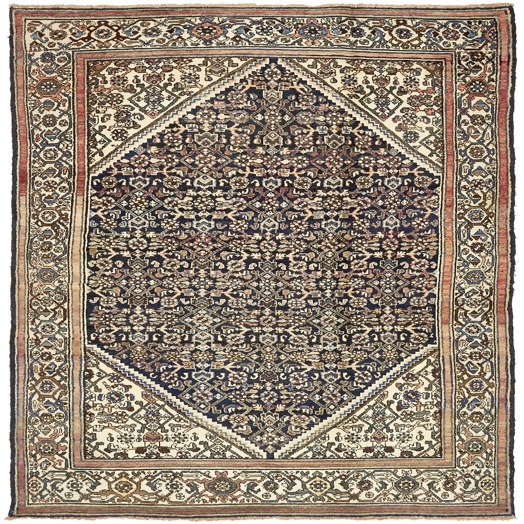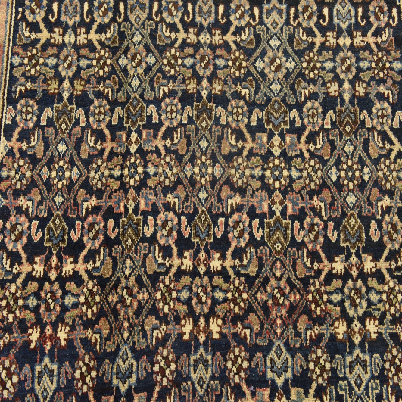 Primary color is Navy Blue. Colors in this rug include: Navy Blue, Cream, Peach, Blue, Green, Olive, Brown.