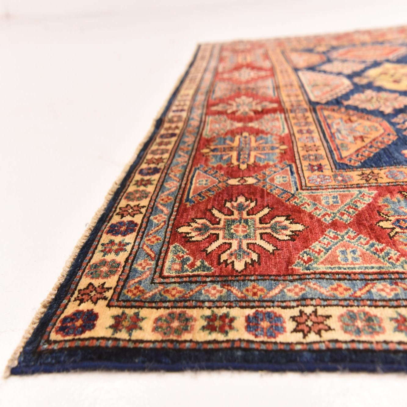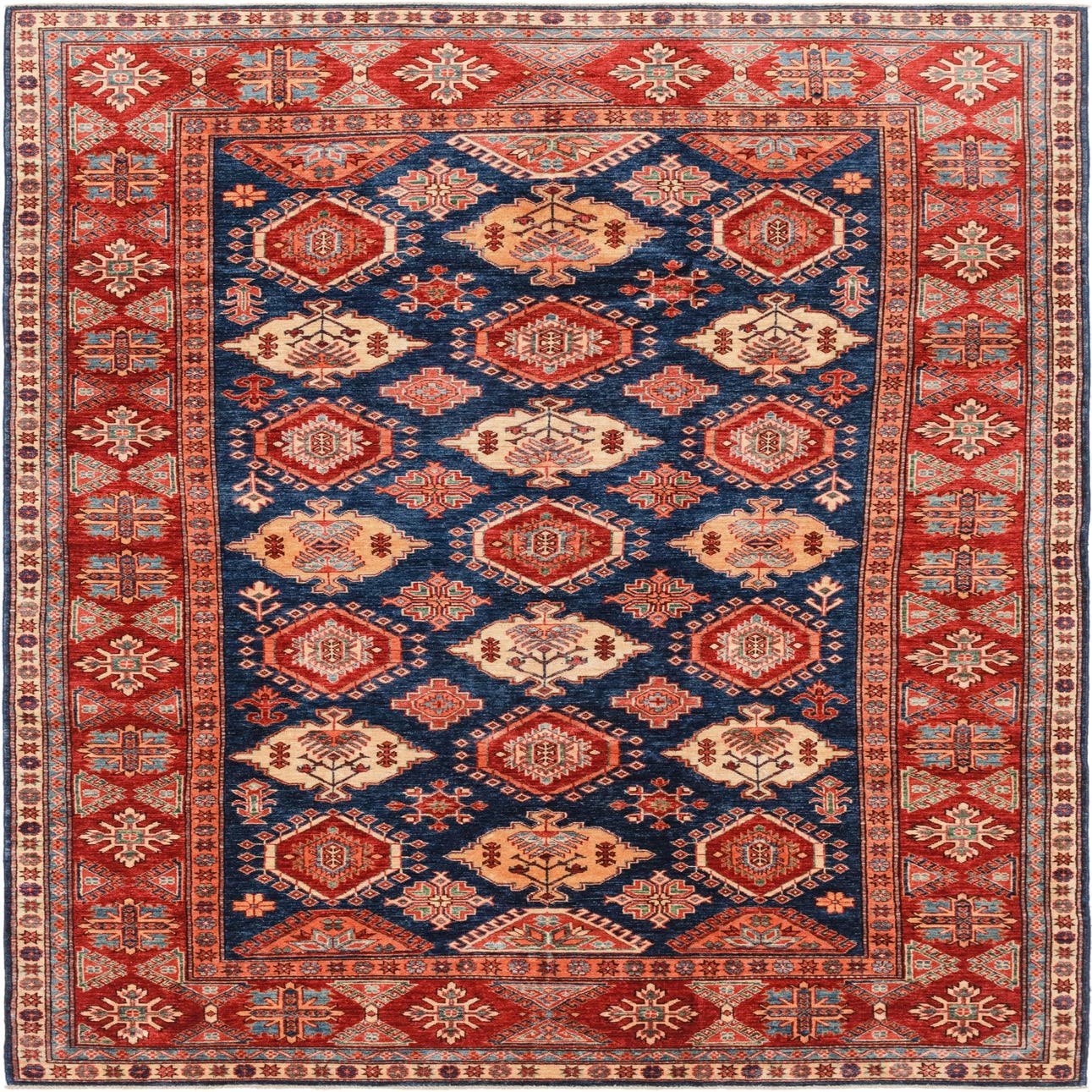 This Kazak collection rug, measuring 6x9 and hand-knotted from 100% hand-spun wool, boasts a robust and dynamic design that complements various interior styles. The rug presents a harmonious blend of colors including navy blue as the background, with accents of black, blue, brown, cream, green, red, salmon, peach, and tan artfully distributed throughout its pattern. This color palette allows for versatile placement in numerous decor themes.
