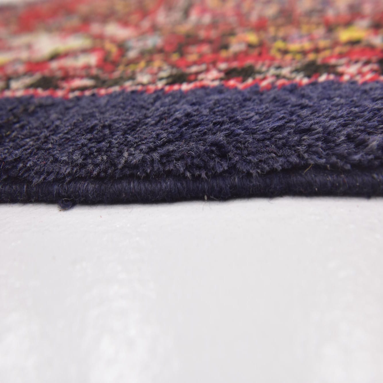 This Kerman collection rug is a hand-knotted piece crafted from 100% wool, showcasing a sophisticated array of colors that include navy blue, blue, light green, red, pink, and gold on a navy blue backdrop. The pattern features a richly detailed allover design, imbued with traditional motifs that offer a sense of timeless elegance. A dense, intricate lattice of floral and geometric shapes creates visual depth, while the border complements the central pattern with a harmonious sequence of similar motifs. Measuring 6x9 feet in dimension, it possesses a texture that is characteristic of quality wool—durable with a soft touch.