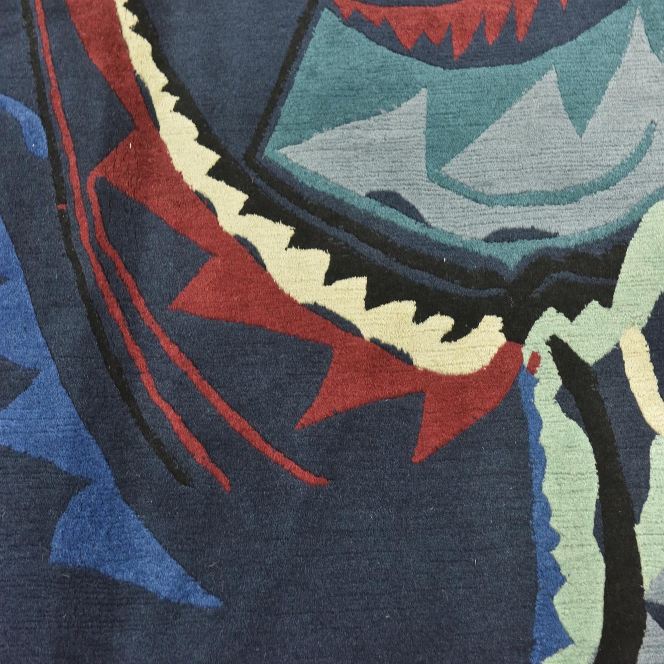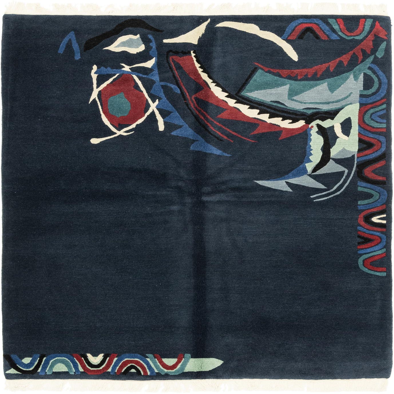 A 6x9 rectangular navy blue wool rug with a modern abstract design featuring red, light blue, and cream accents.