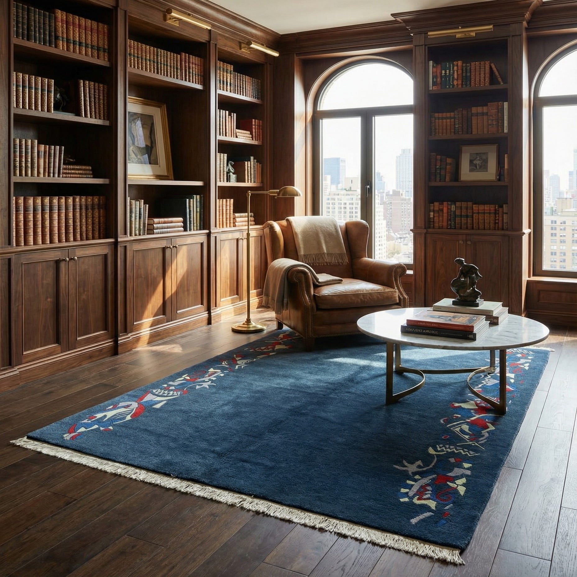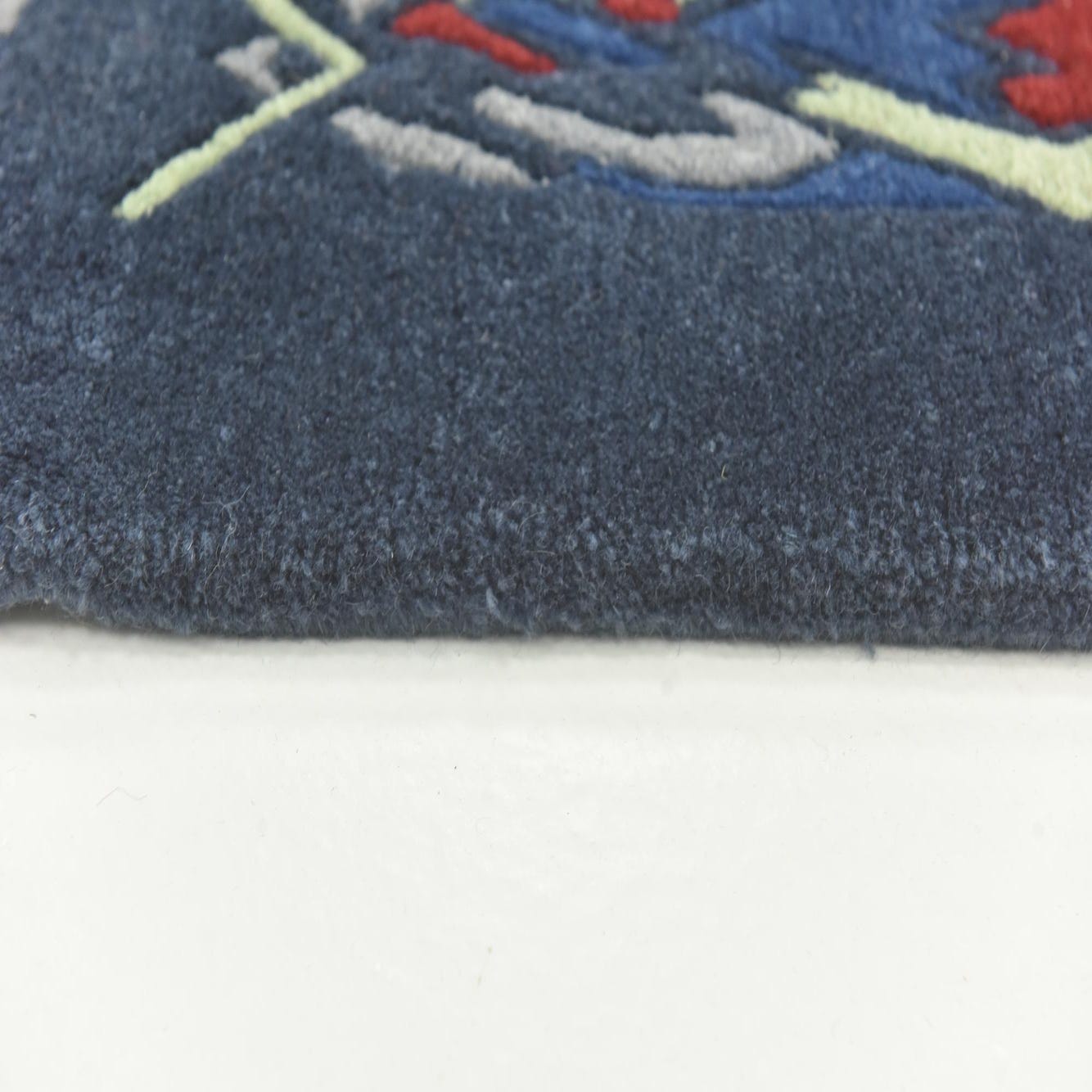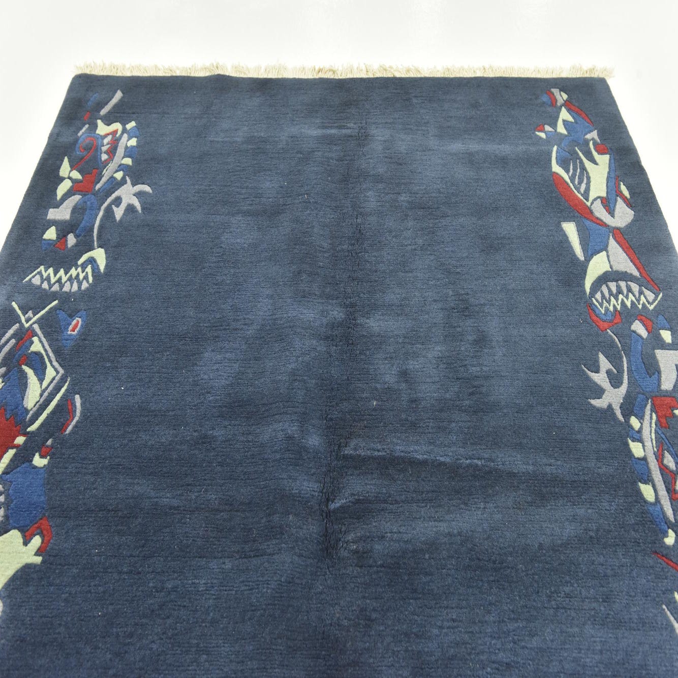 A 6x9 rectangular navy blue wool rug featuring modern abstract patterns in red, blue, and grey along its vertical borders, with white fringe.