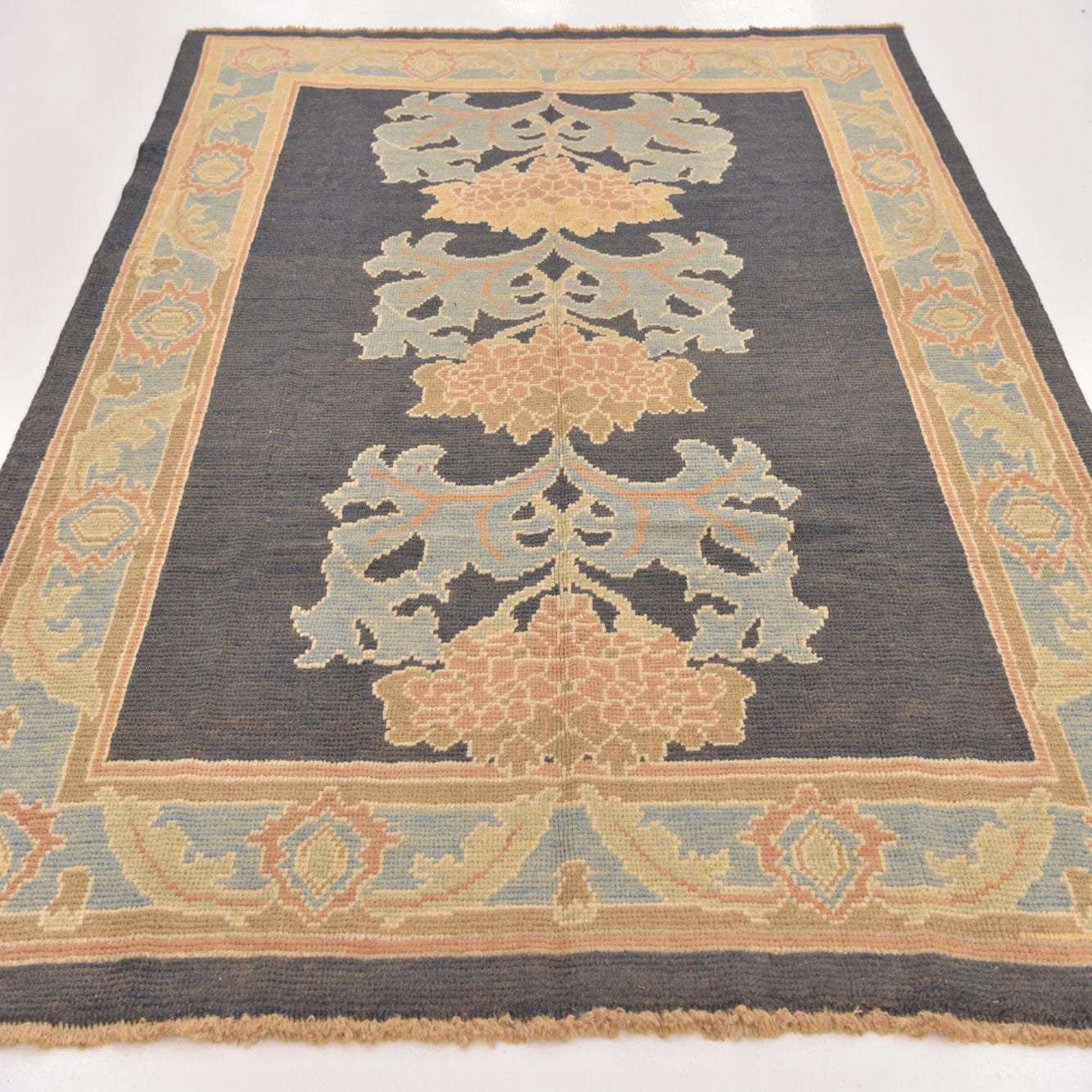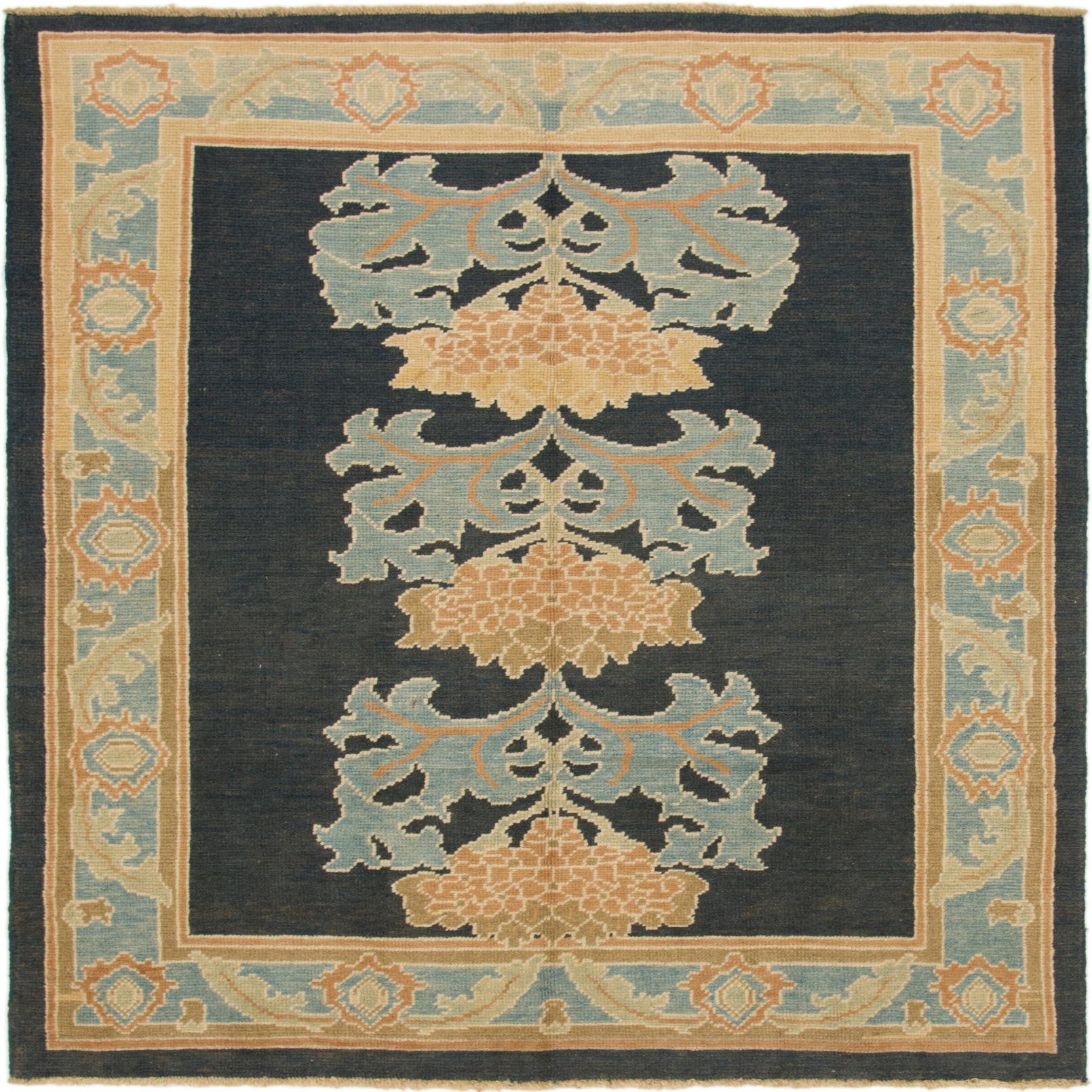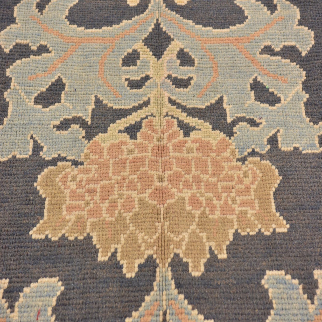 This Oushak collection rug, measuring 6x9 and hand-knotted from 100% wool, offers a harmonious blend of classic design and contemporary hues. The rug presents a striking pattern featuring stylized botanical motifs and intricate border detailing. Anchored by a deep navy blue background, the pattern comprises an elegant mix of beige, blue, brown, and orange, giving the piece a balanced and versatile color palette. The wool texture adds a natural softness underfoot, complementing the rug's aesthetic appeal.