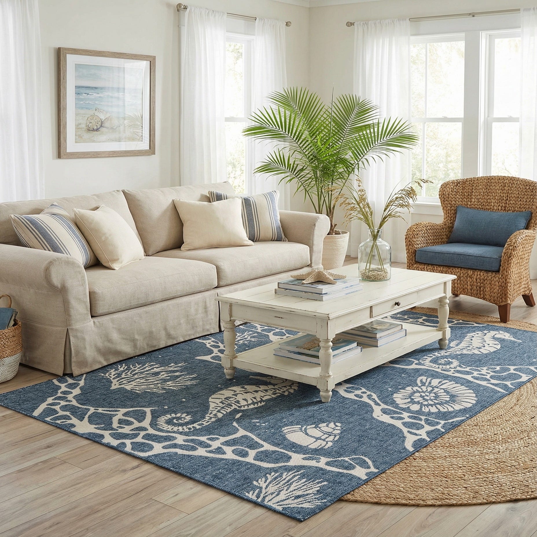 A 6x9 rectangular navy blue indoor/outdoor rug with a white coastal pattern featuring seahorses, starfish, shells, and coral.