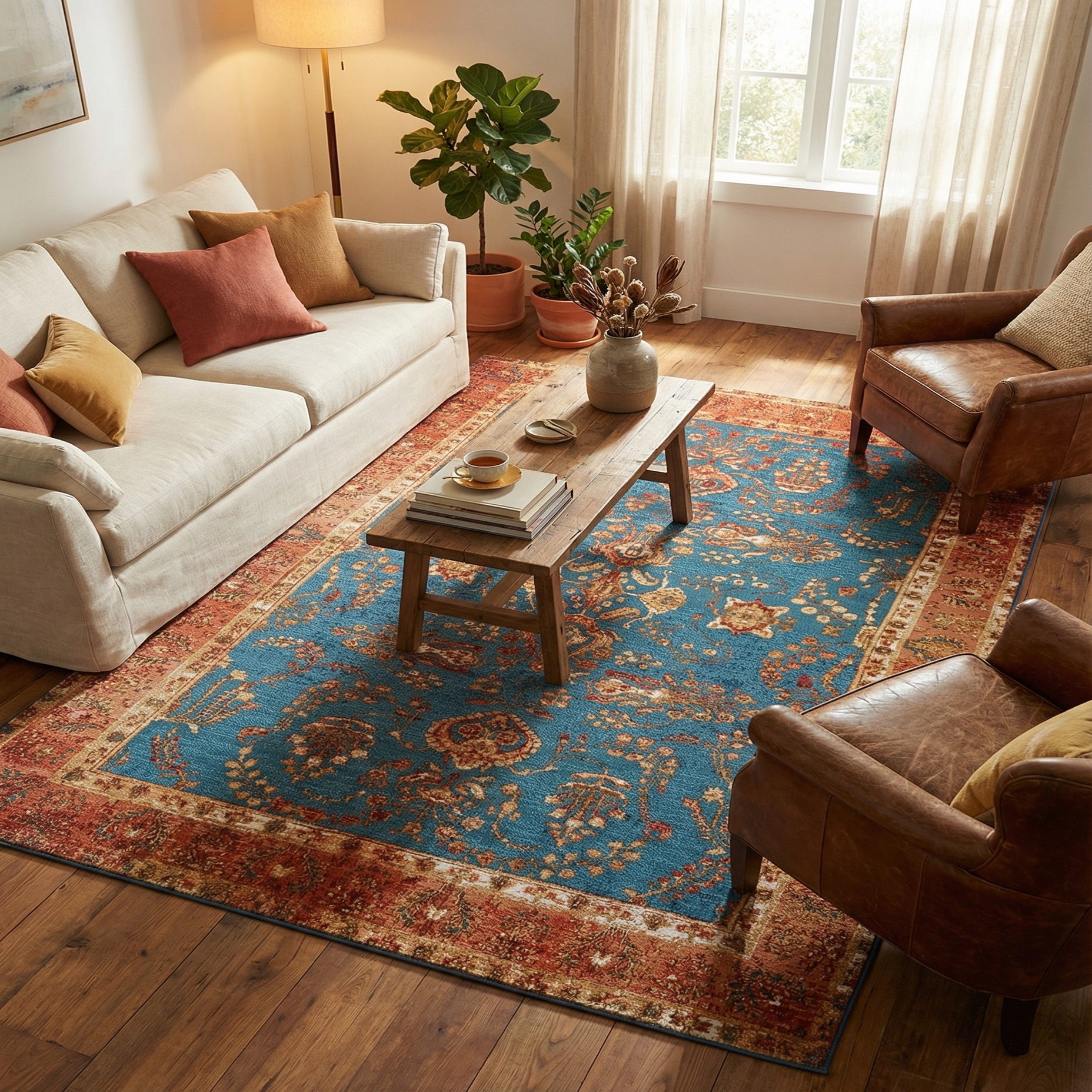 Machine-made from 100% polypropylene, the surface has a low, dense pile that feels smooth underfoot and handles daily traffic with ease. Use it to ground a seating area with neutral sofas and brass or wood accents, layer it under a dark-wood dining table to introduce bold color, or place it on a covered patio or sunroom where traditional style meets practical performance. It pairs especially well with natural textures—rattan, linen and leather—and anchors both transitional and cottage-inspired interiors.