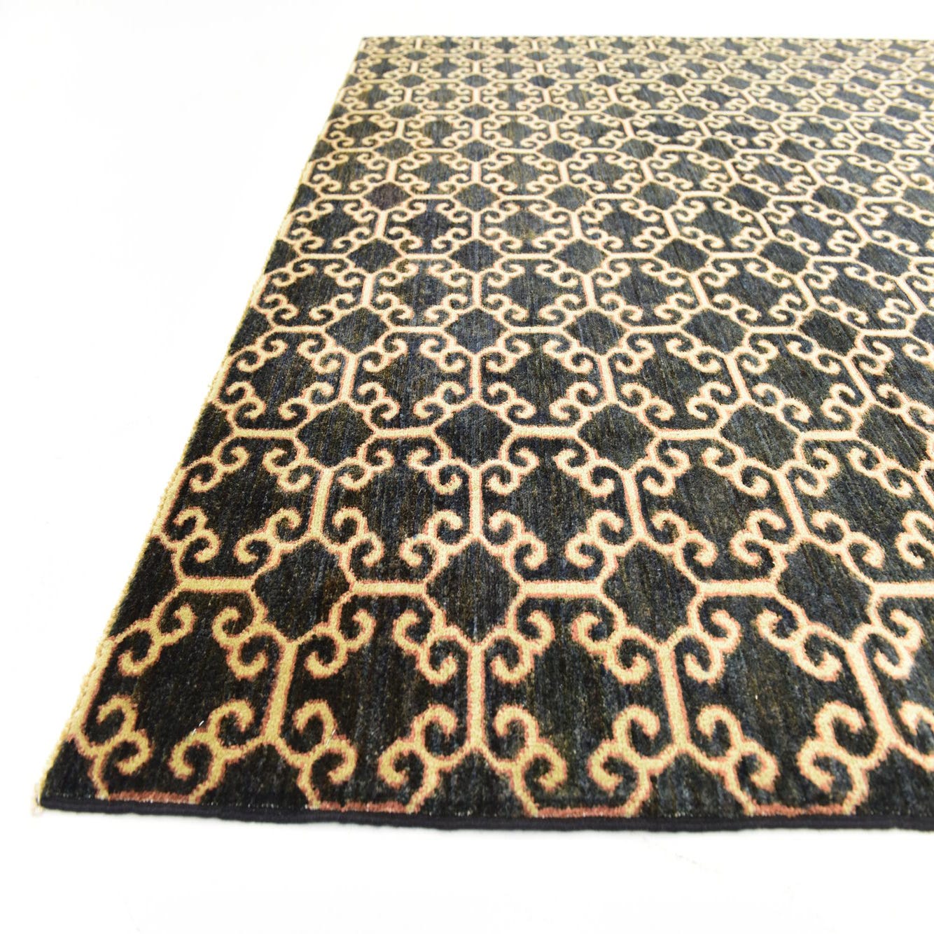 A 6x9 rectangular navy blue Oriental rug with a repeating gold geometric scroll pattern, perfect for a living room.