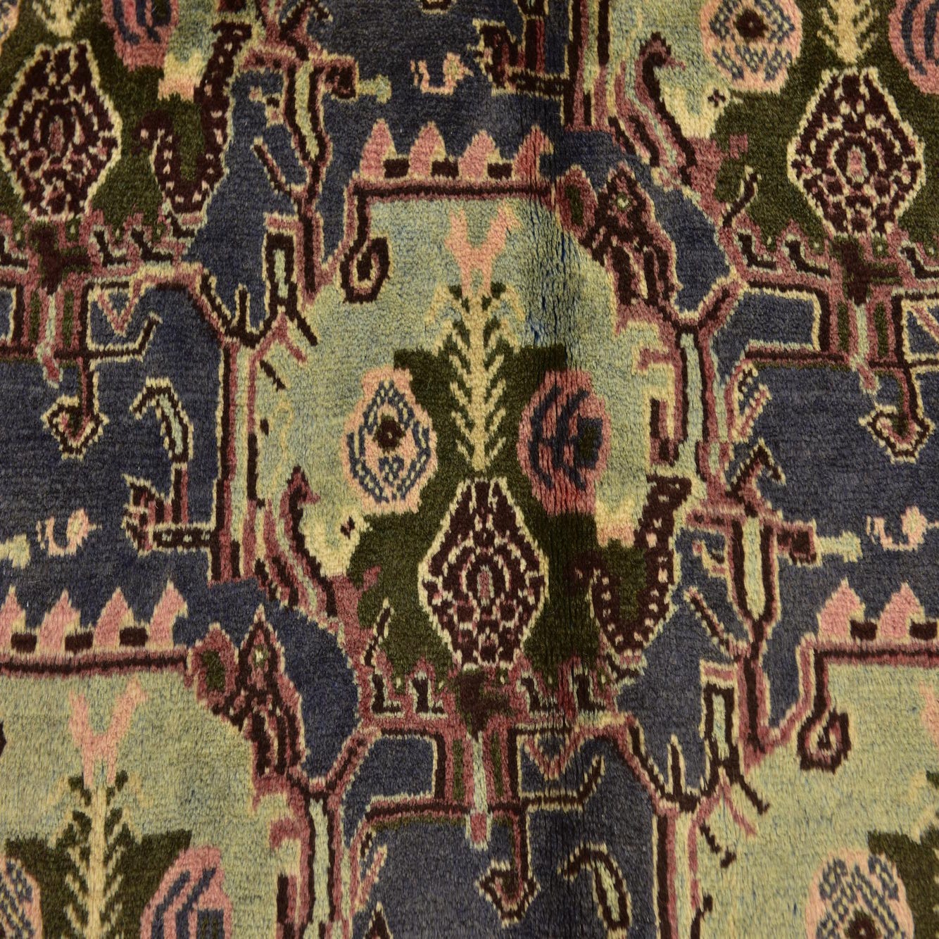 Primary color is Navy Blue. Colors in this rug include: Navy Blue, Beige, Blue, Light Green, Peach, Red, Rust Red, Olive.