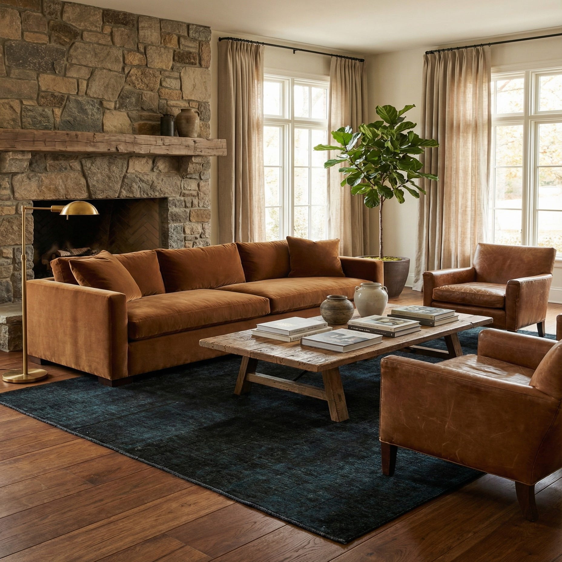 This piece works well where you want a strong, moody foundation: beneath a leather sofa in a modern living room, layered under a bed with crisp linens and warm wood tones, or in a home office to anchor lighter furnishings. Pair it with brass or matte black accents, neutral textiles, and natural woods to balance the deep color, or use it in a minimalist or industrial setting to introduce warmth and tactile contrast.