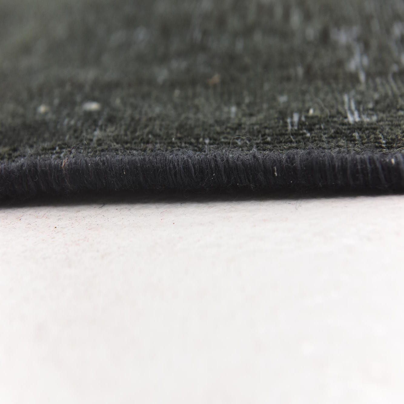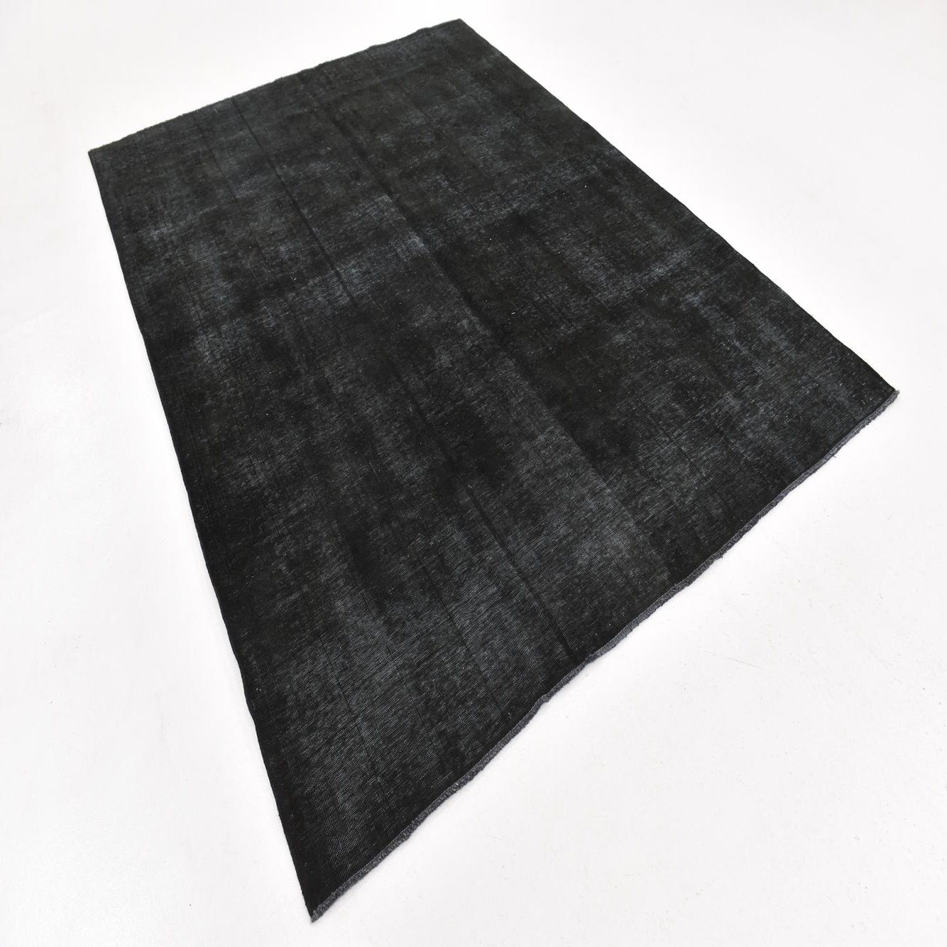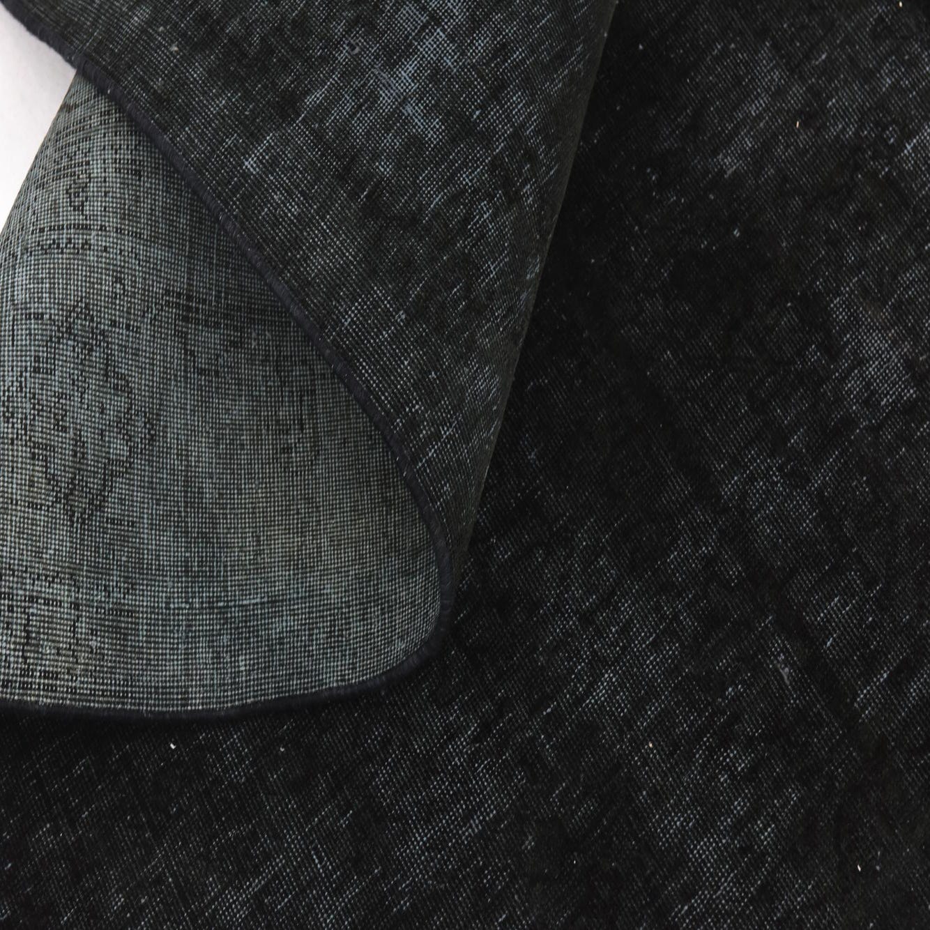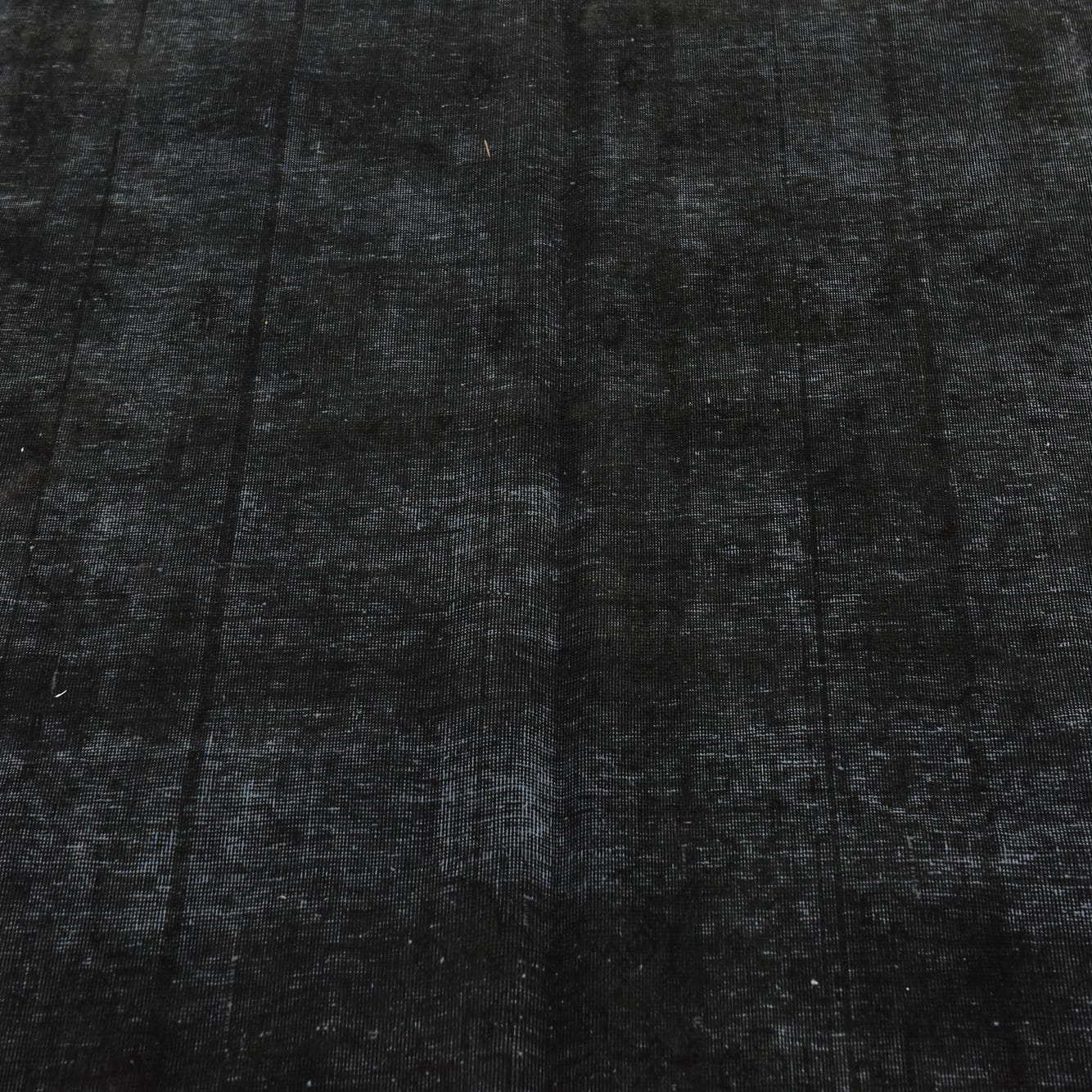 Hand-knotted from 100% wool, this rug presents a deep navy-blue field softly overlaid with black tonal variations and subtle vertical striations. The pattern is intentionally understated — an aged, overdyed effect that delivers depth and movement without a defined motif or border. Running your hand across the surface, you’ll notice a low-to-medium pile with a gentle nap and a slight sheen that highlights the wool’s natural texture and the rug’s handcrafted construction.