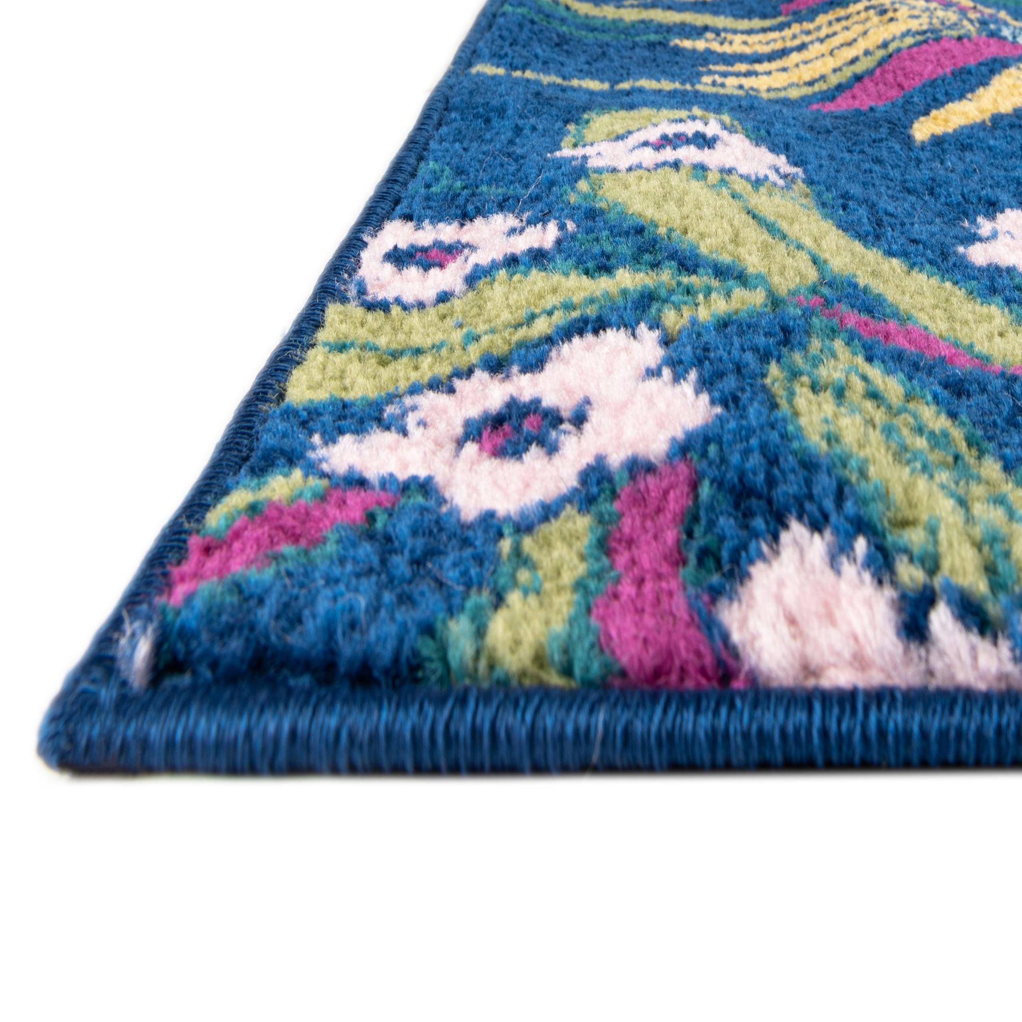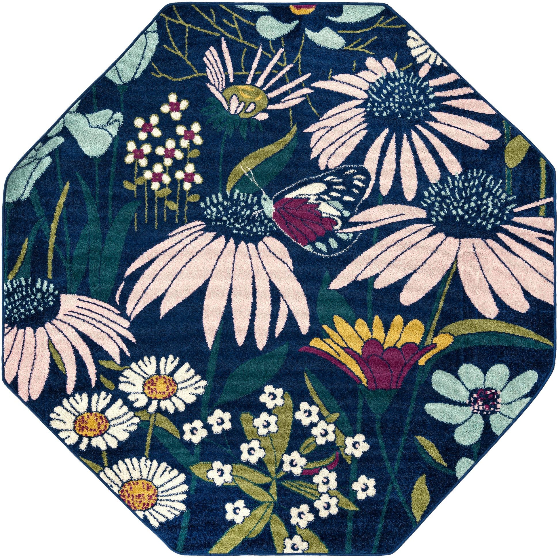 Part of the Bloom collection, this 7 Ft Octagon rug is machine woven using 100% polypropylene, known for its durability and ease of maintenance. The piece features a beautiful botanical motif that vividly comes to life on a navy blue background. The pattern is a harmonious blend of navy blue, blue, ivory, green, light blue, light green, purple, yellow, pink, and teal, creating a vibrant yet balanced visual effect.