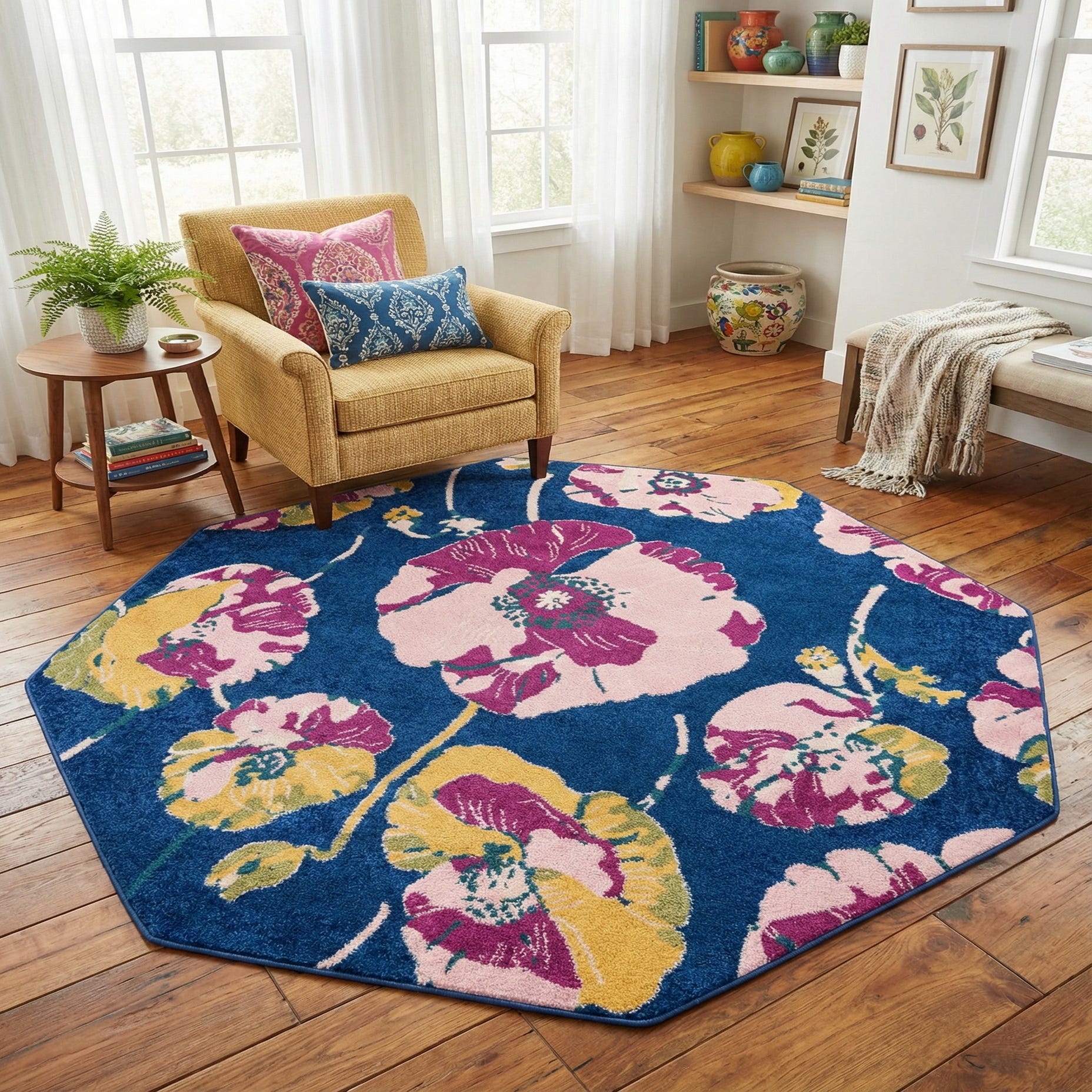A bold, oversized floral pattern blooms across a navy blue ground, with large, painterly petals in pink and purple accented by pops of yellow, teal, and green and touches of ivory for contrast. The octagonal silhouette gives the design extra visual interest, turning a classic floral motif into a contemporary focal piece that reads like modern art underfoot. The composition balances lively color with a grounded background so the pattern stands out without overwhelming the room.