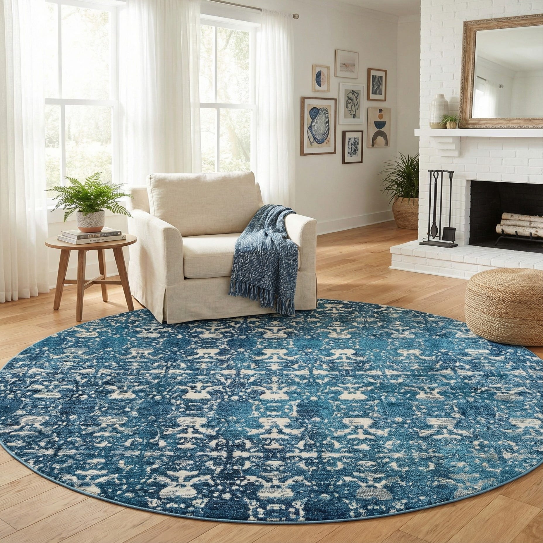 This round shape works well to define a circular dining setting, ground a cozy reading nook, or soften an entryway with a touch of color. Pair it with warm wood tones and brass accents for a transitional look, white or light-gray upholstery for a contemporary coastal palette, or muted teal pillows and beige throws to pull the colors together in a casual living room.
