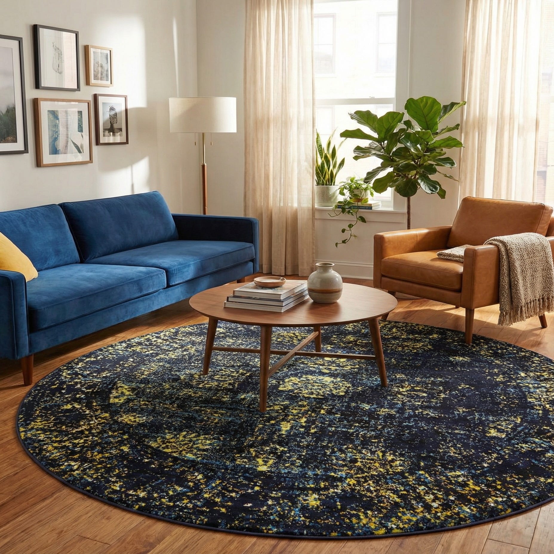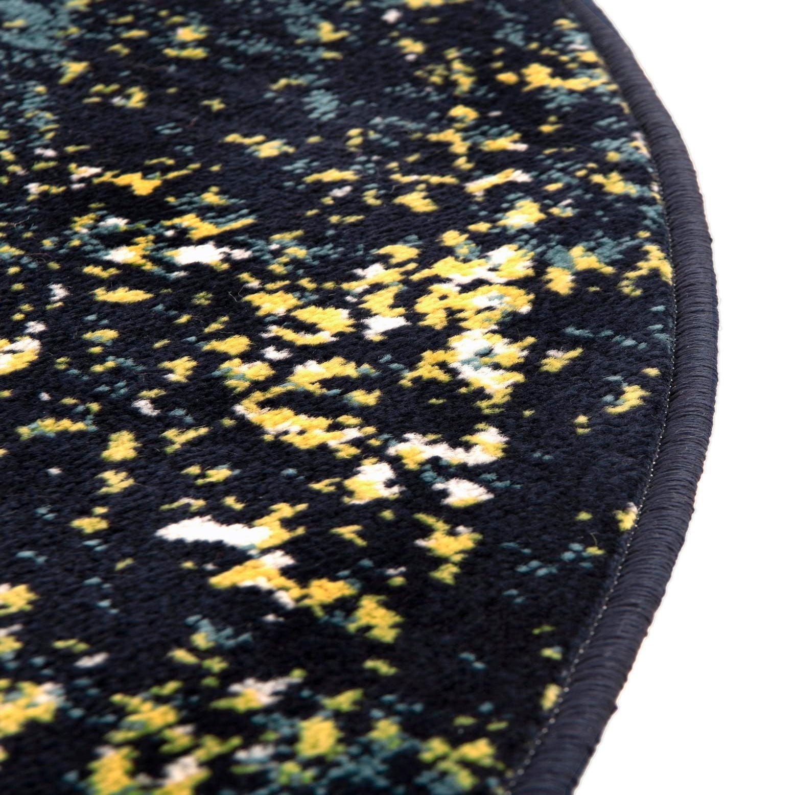 The Monte Carlo collection presents a modern 7-foot round rug crafted from 100% polypropylene, offering durability and ease of maintenance. This rug features a compelling abstract pattern that melds navy blue, yellow, and light blue hues to create a dynamic visual impact. The navy blue background sets a deep and rich tone for the vibrant yellow and soft light blue splatters, resulting in a distinctive piece that can anchor a room with its bold design.