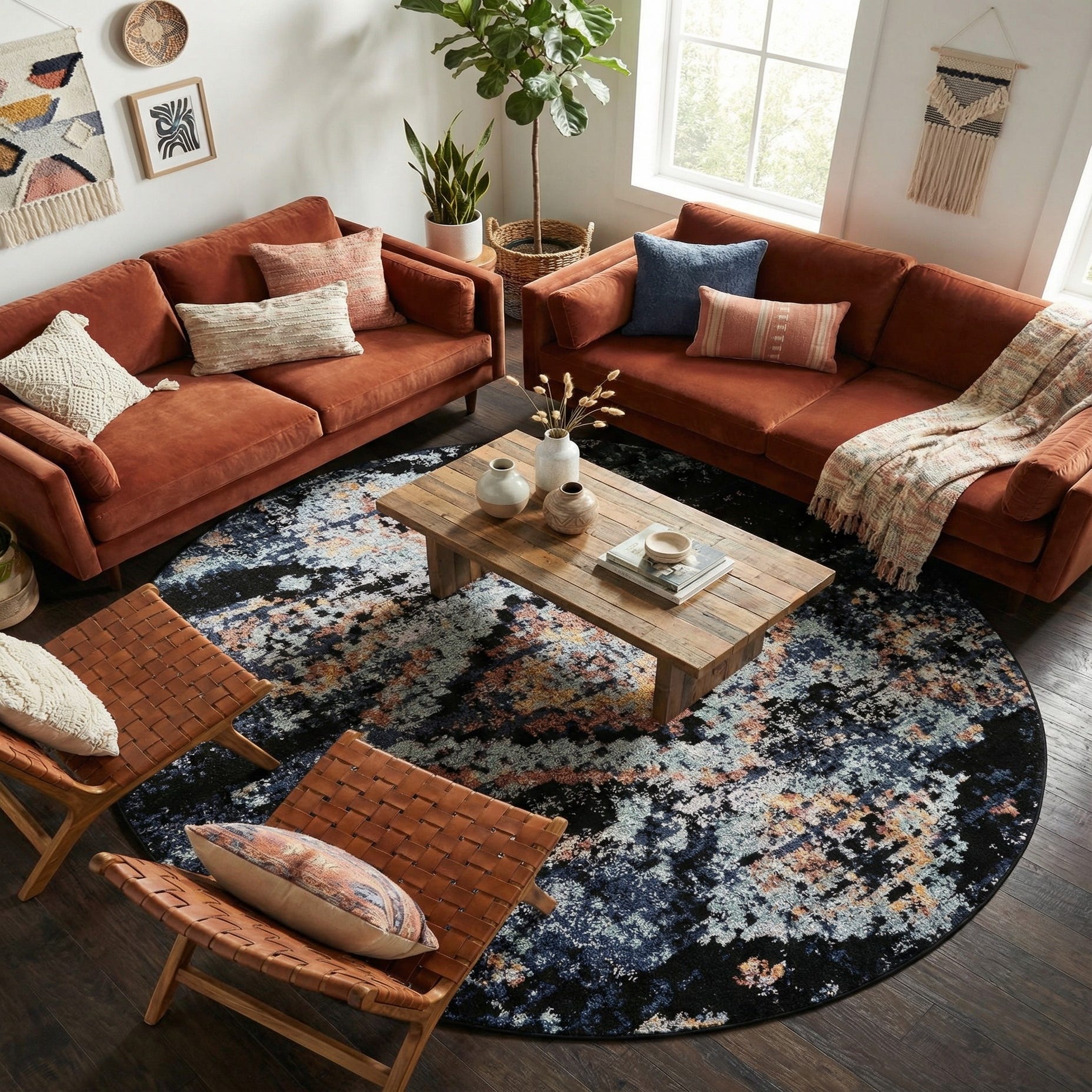 Machine-made from 100% polyester, the rug has a soft, low-to-medium pile with a subtle sheen from the synthetic fibers that feels smooth underfoot. Its round shape works well to anchor a seating area beneath a circular coffee table, define a cozy reading nook, or sit beneath a small dining or breakfast table. Pair it with warm wood furniture and brass or matte-black accents for a collected, mid-century modern look, or layer it over a natural-fiber rug in an eclectic, bohemian setting to add color and pattern contrast.