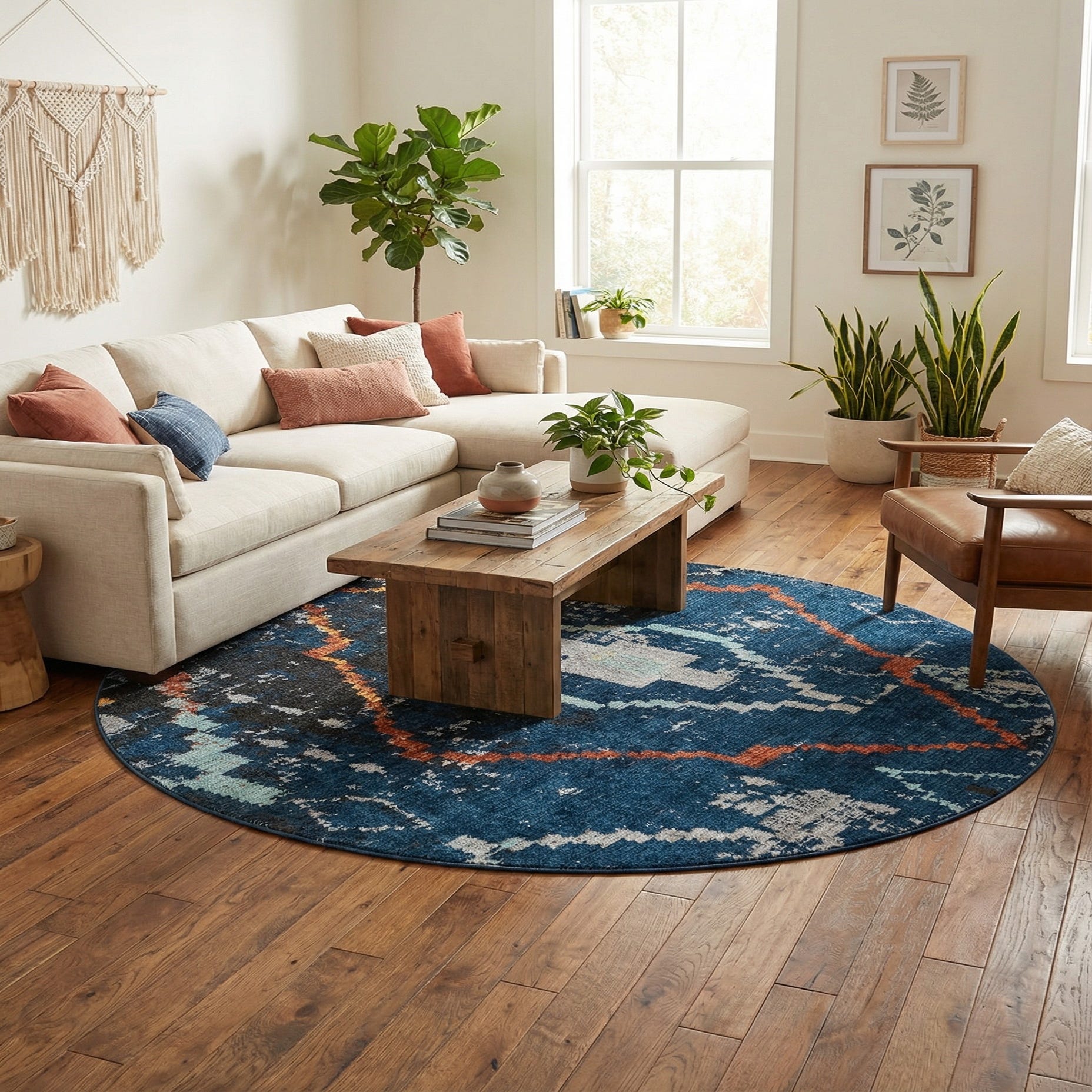 Machine-made from 100% polyester, the pile is soft and slightly velvety underfoot with a low-to-medium profile that layers easily over hardwood or tile. This round shape works beautifully under a circular dining table, as the focal point in a reading nook, or centered in a cozy living area to define seating. Pair it with warm wood tones and brass accents for a mid-century modern look, combine it with textured pillows and rattan for a bohemian vibe, or let it ground a neutral contemporary space with a pop of color.