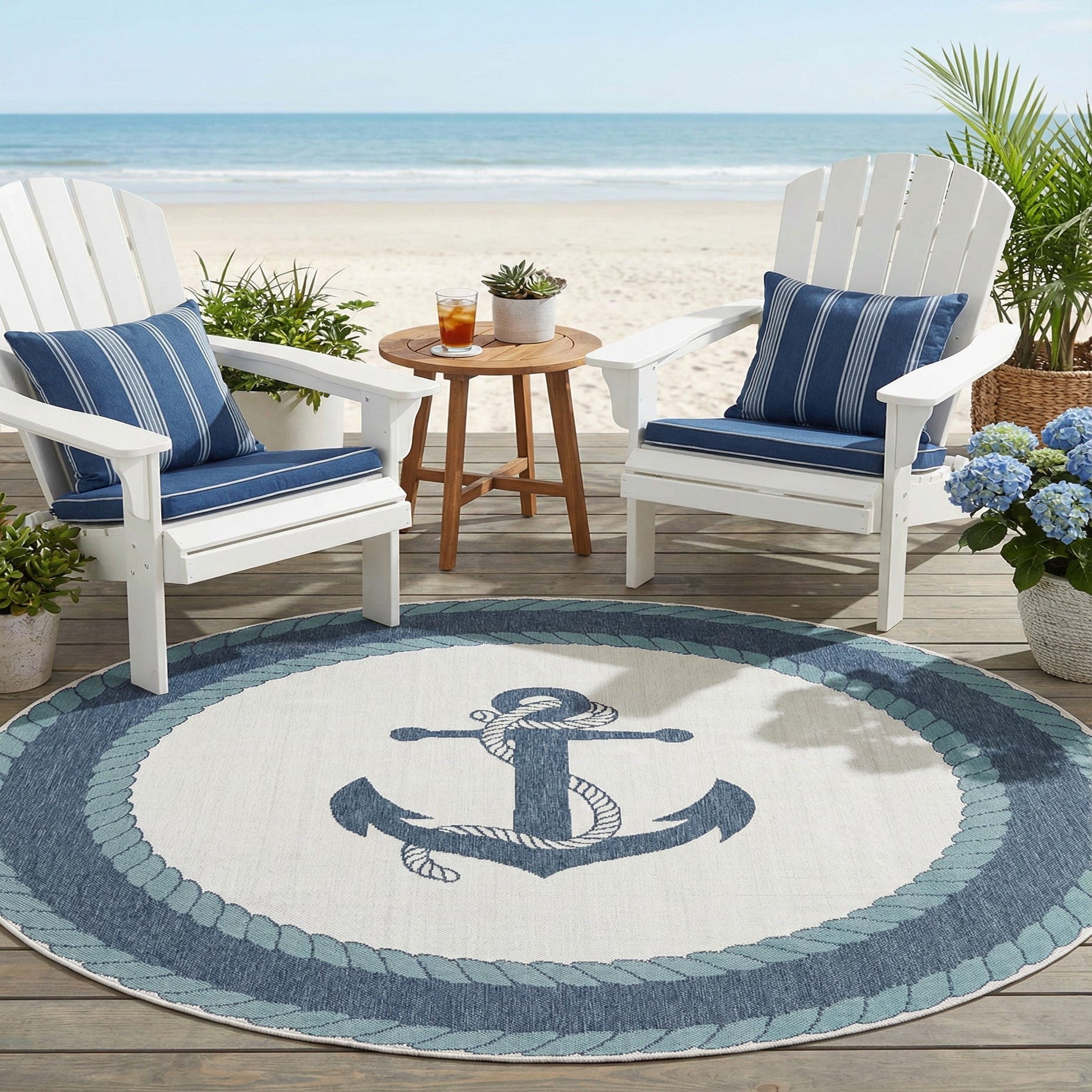 This Outdoor Coastal collection rug features a bold, centerpiece anchor motif in a rich navy blue set against a cream background, imparting a nautical theme that captures the essence of seaside living. The design is framed by a harmonious concentric pattern of braided rope in shades of navy blue, gray, and green, enhancing the marine aesthetic of the rug. With a flatweave construction, this 7-foot round rug is crafted from 100% polypropylene, offering durability and easy maintenance.