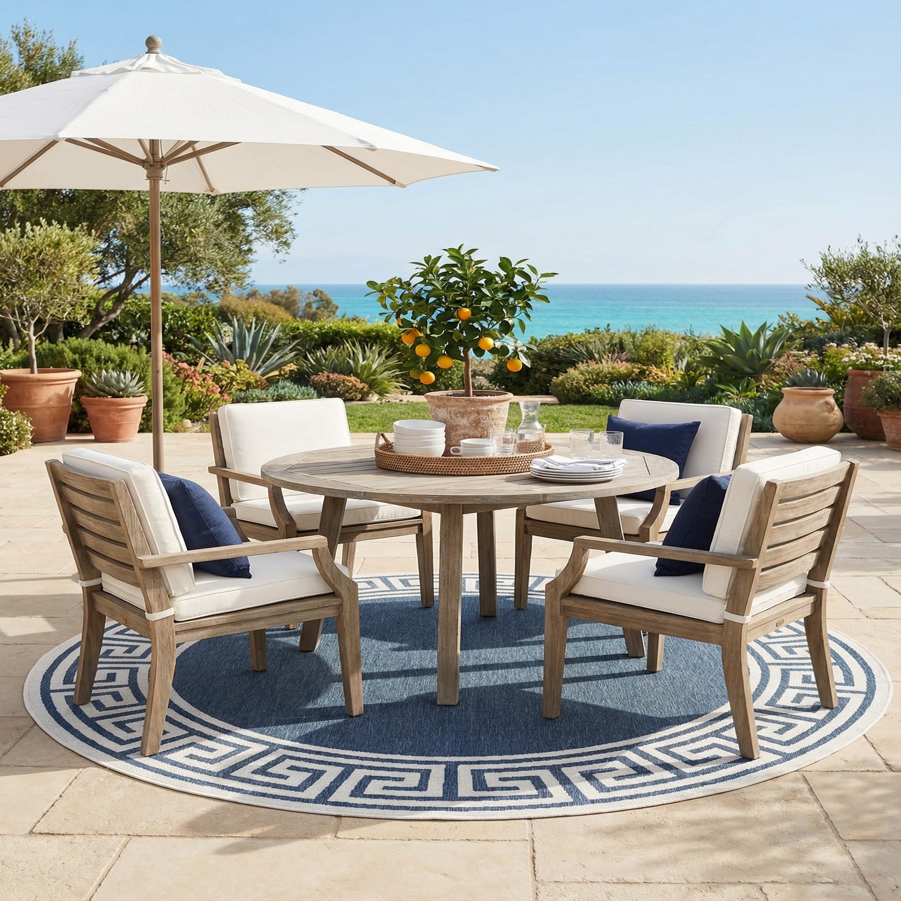 This Outdoor Coastal Collection rug, with a 7-foot round dimension, showcases a classic and timeless pattern that brings a touch of elegance to any outdoor setting. Constructed with machine-woven 100% polypropylene, it offers durability and ease of maintenance. The rug features a strong navy blue background complemented by a striking ivory Greek key border design, adding visual interest and a nautical flair to the piece.